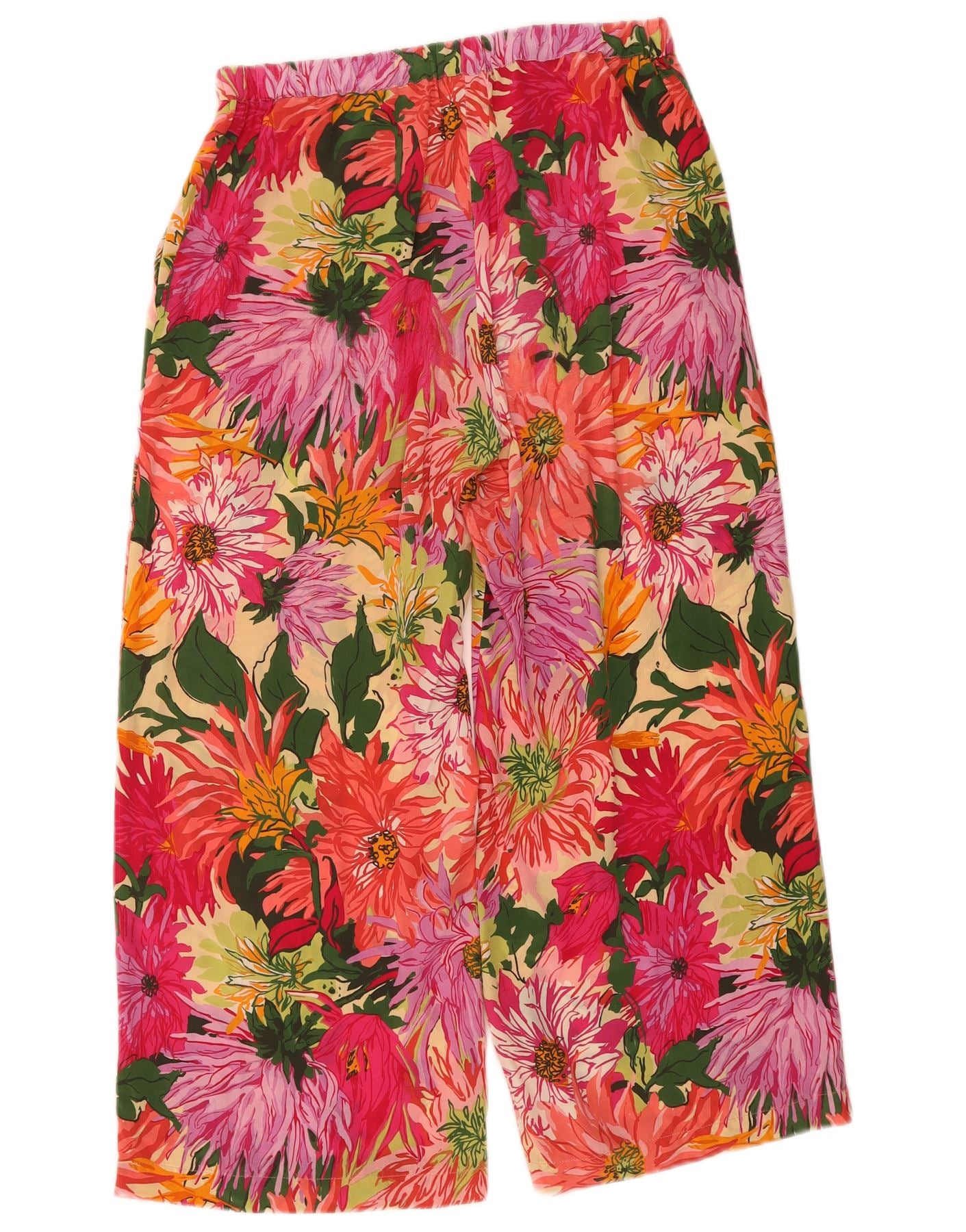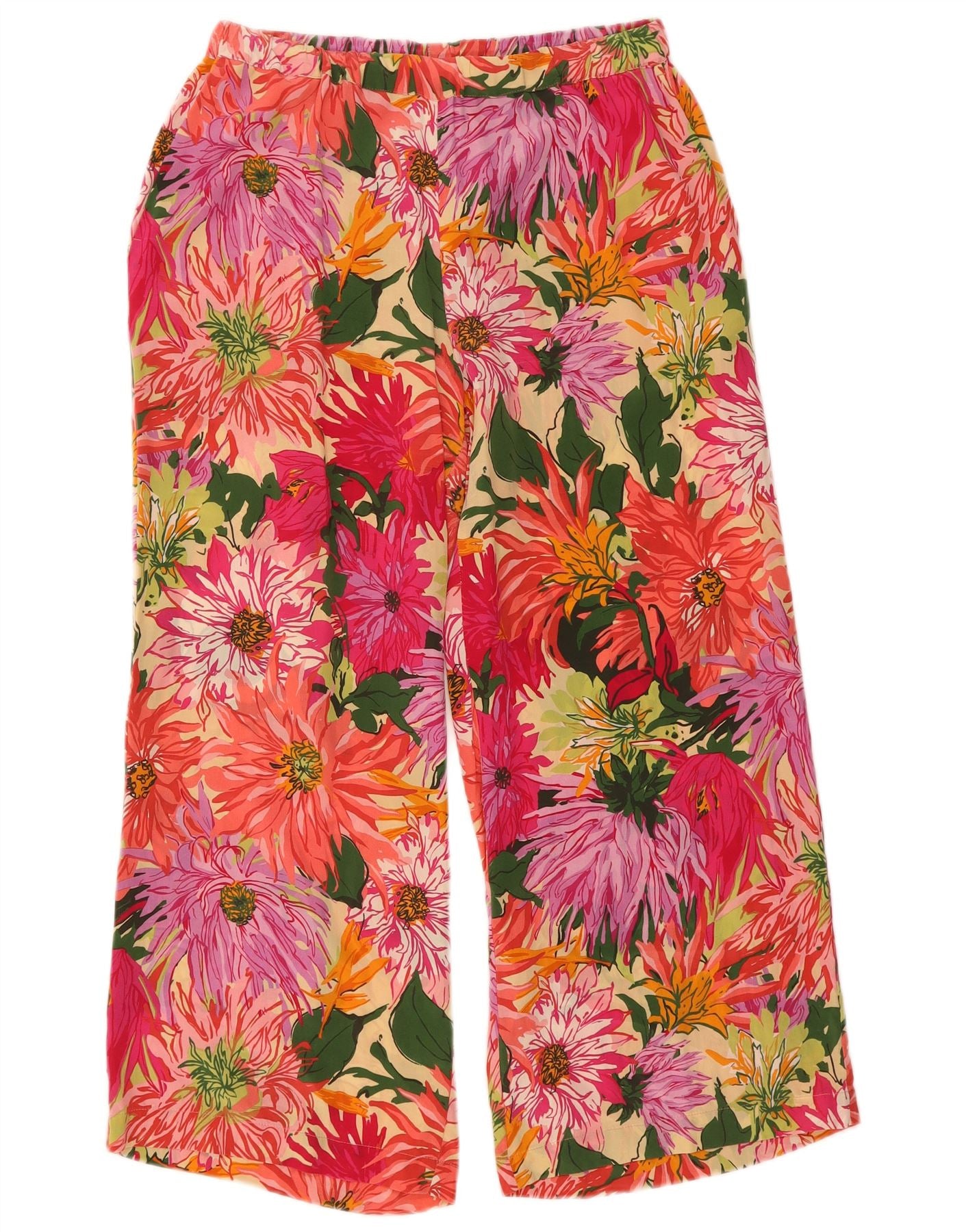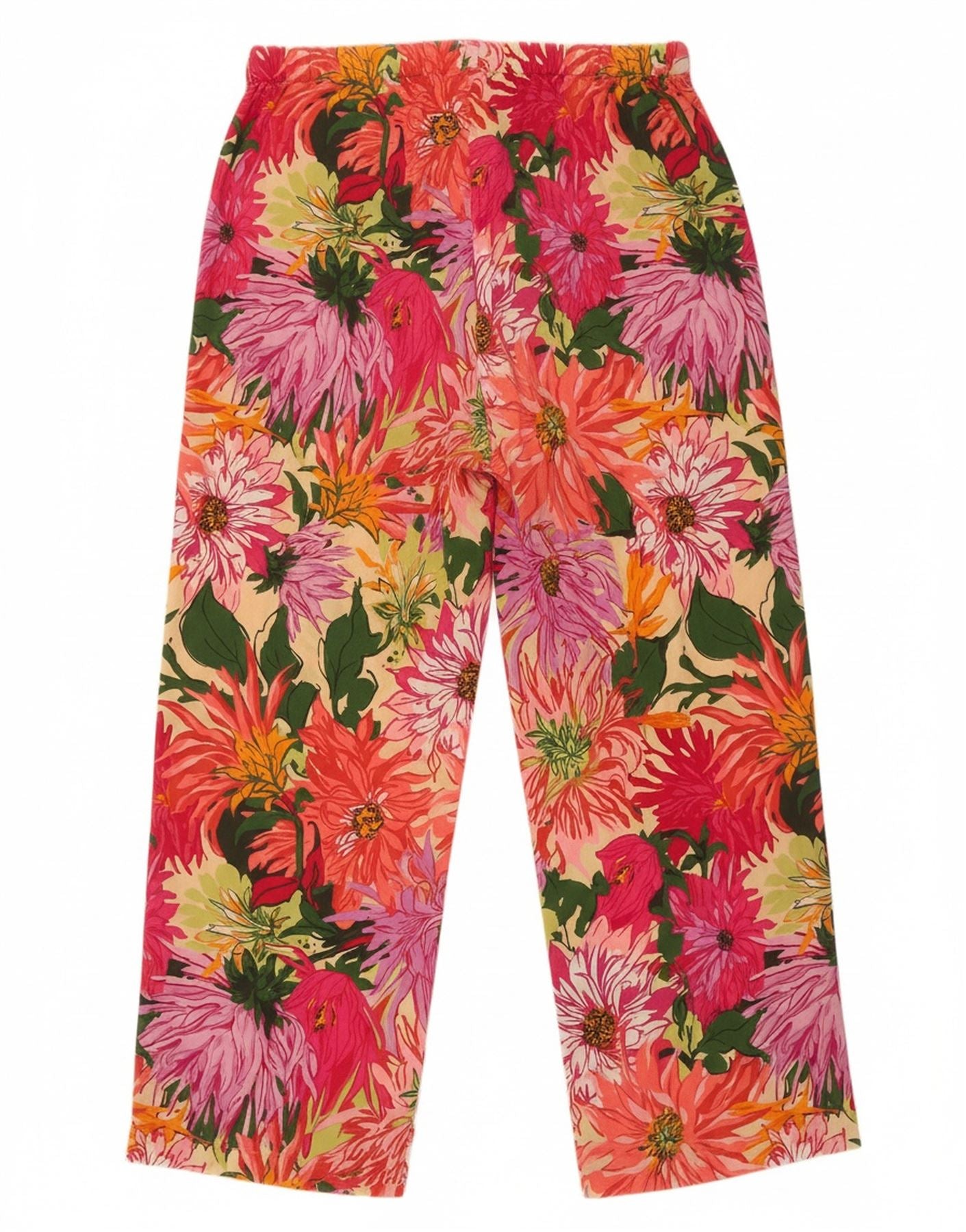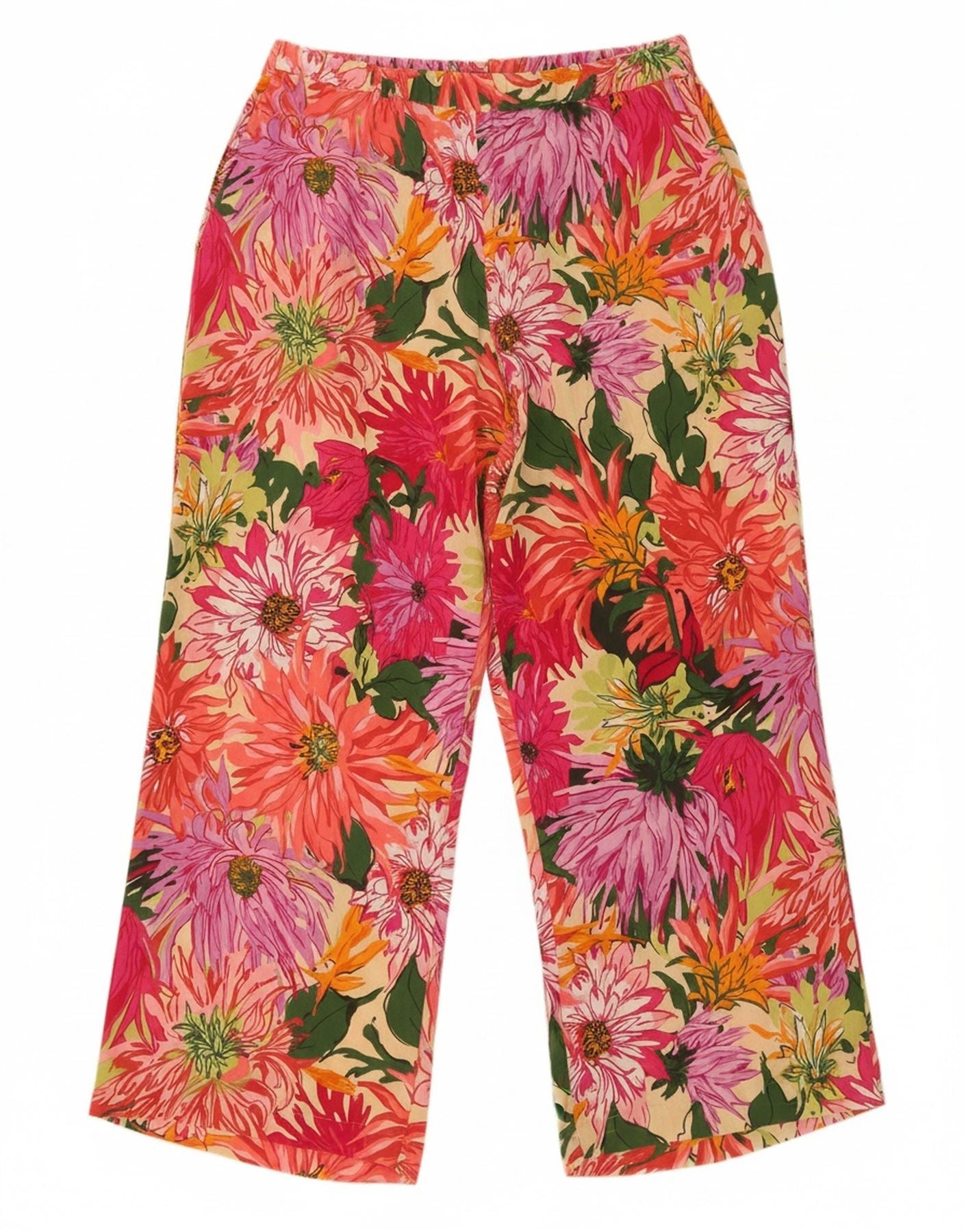 - AI Description: These Weekend Max Mara women's trousers are crafted from luxurious 100 percent woven silk, offering a smooth, fluid drape. They feature a vibrant multicoloured floral pattern, blending pink, red, and green tones. Designed with a relaxed, wide-leg fit, they boast a comfortable pull-on elastic waist. Practical pockets add functionality, while the cropped length provides a contemporary, tropical style.