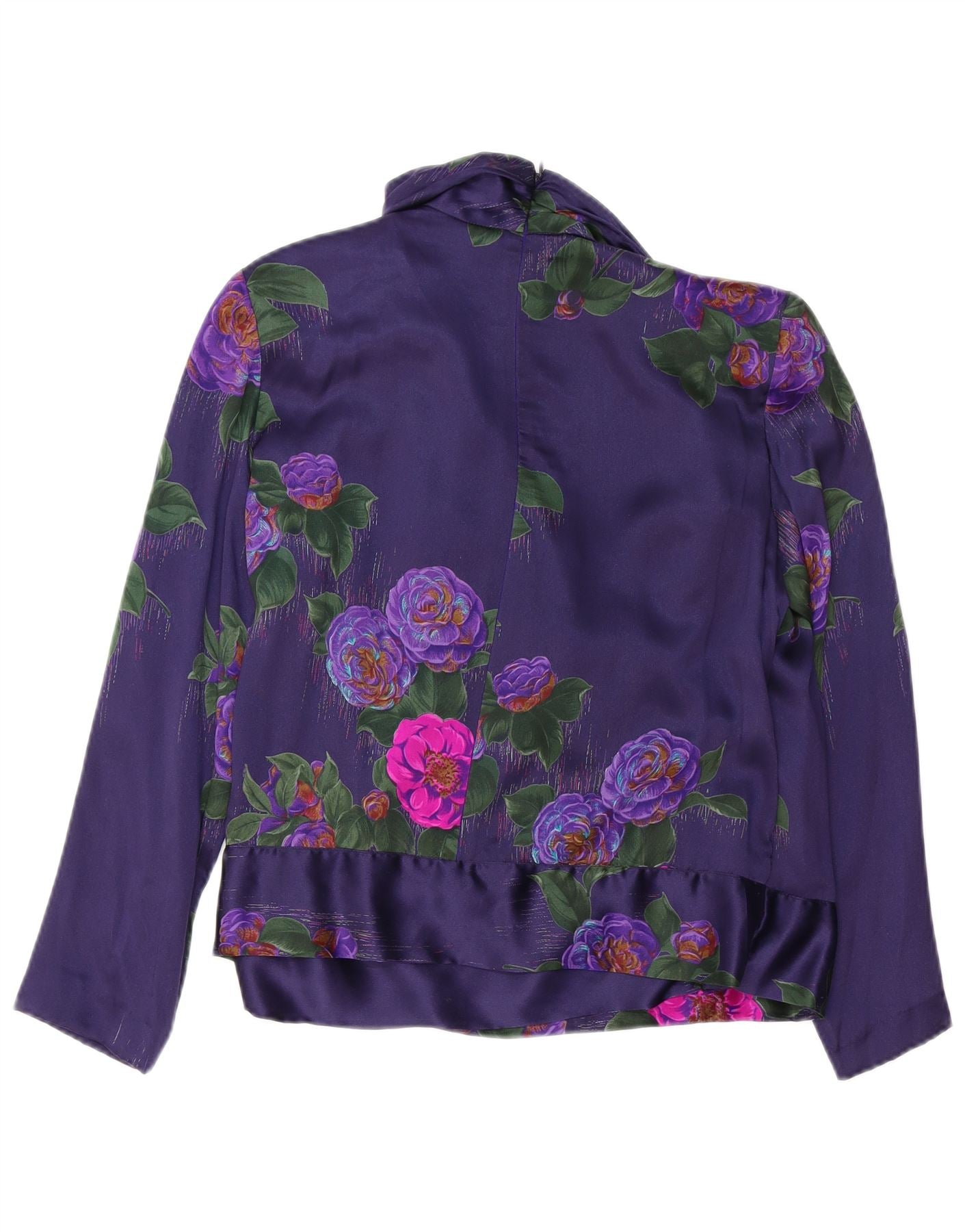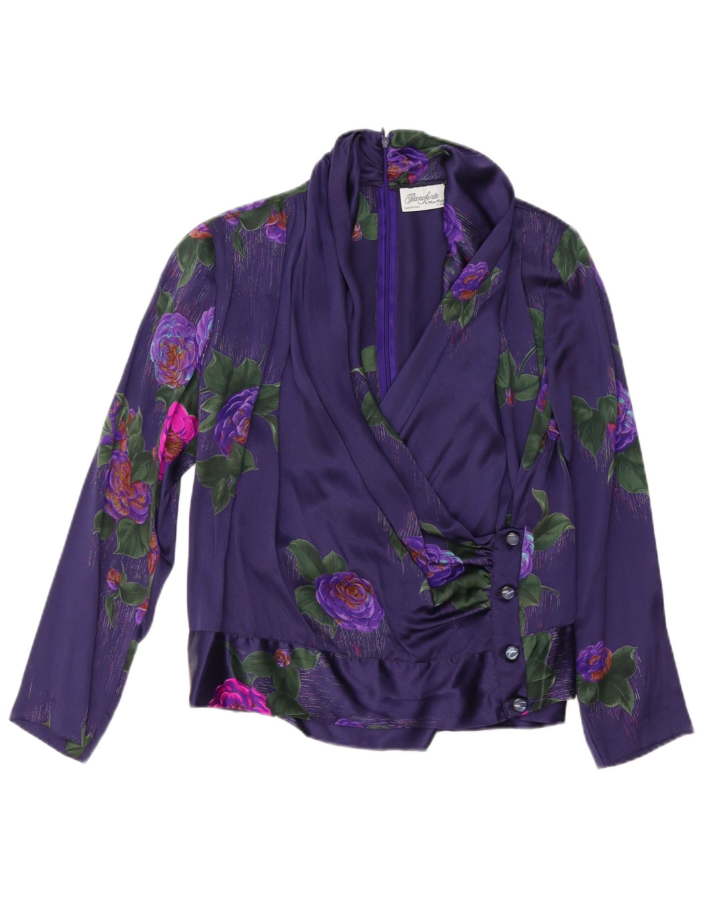 - AI Description: This Max Mara womens blouse top is crafted from luxurious pure silk satin, offering a smooth, lustrous finish. It features an elegant purple floral pattern. The V-neckline and long sleeves create a sophisticated silhouette. A regular fit ensures comfortable wear. The design includes a subtle zip closure and button accents for refined detail.