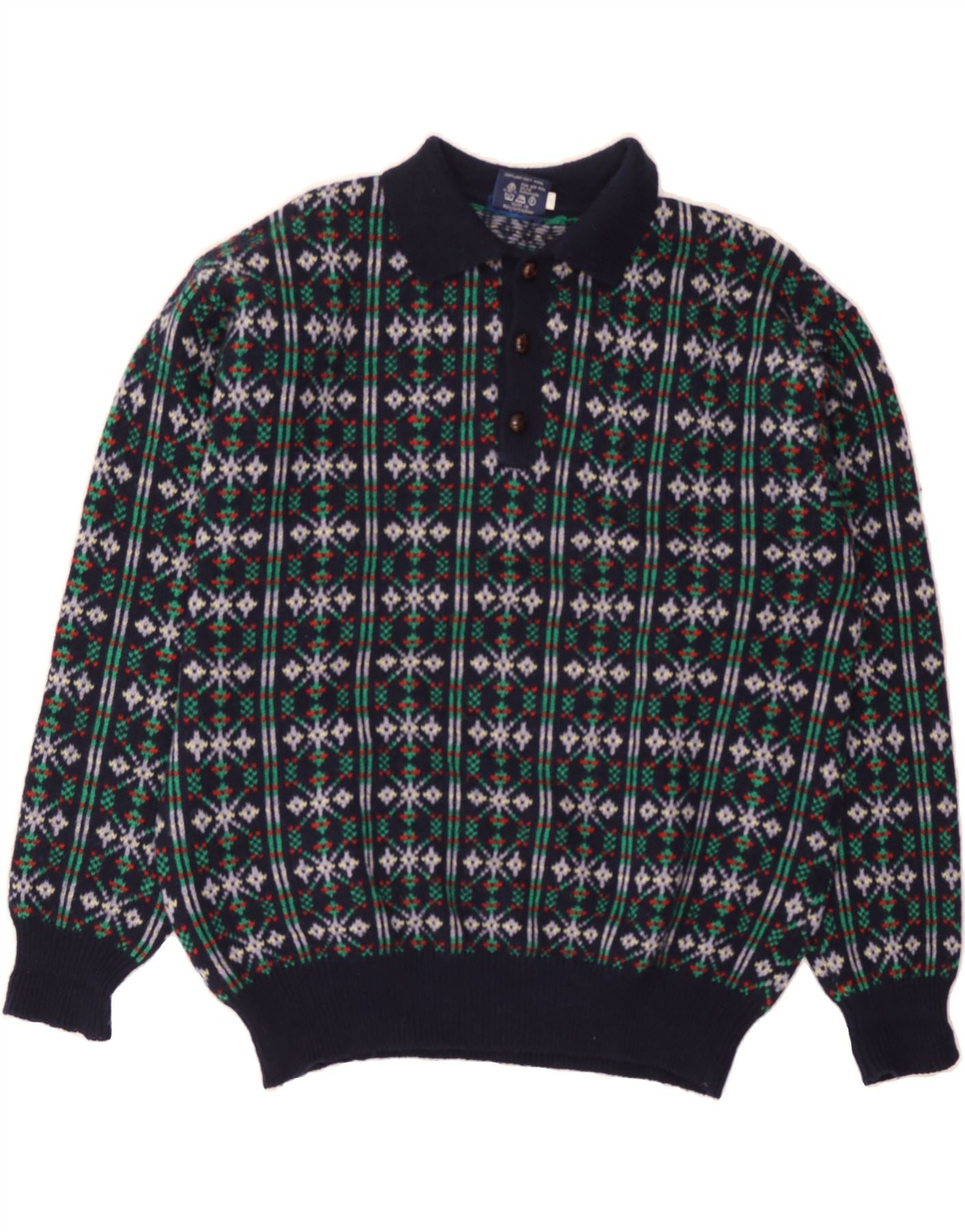 MC NEAL Mens Polo Neck Jumper Sweater XL Navy Blue Fair Isle Wool
