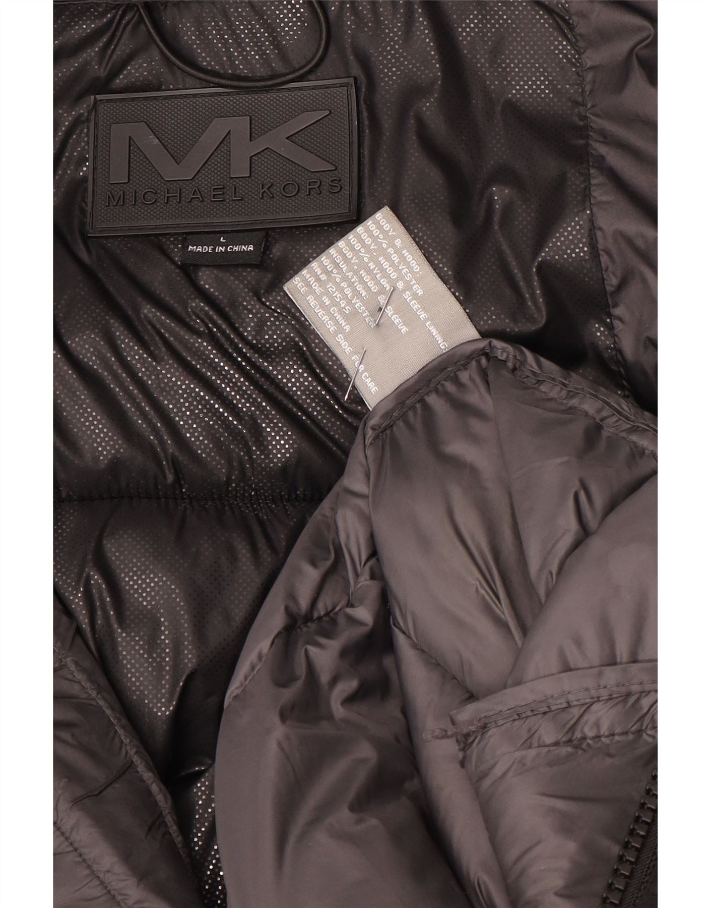 - AI Description: This Michael Kors womens padded coat is crafted from black woven polyester offering a warm padded texture. It features a collared neckline and a practical hood for added protection. Long sleeves provide full coverage. The regular fit ensures comfortable layering. A full zip closure is complemented by button fastenings. Multiple pockets add functionality. A subtle brand logo accents the design.