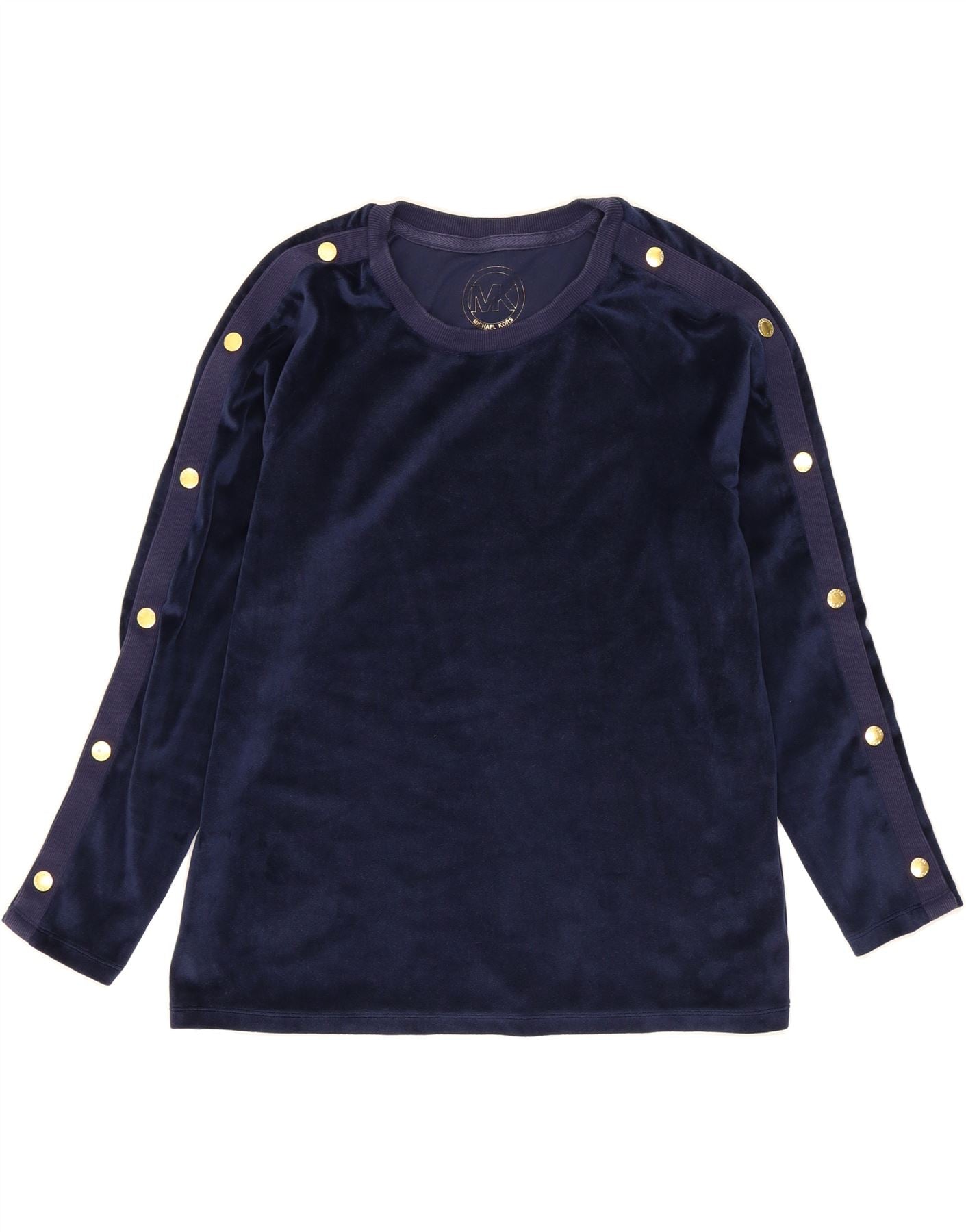 - AI Description: This Michael Kors women's set offers classic style and comfort. The navy blue velvet fabric, a blend of polyester and elastane with cotton trim, creates a luxurious feel. The regular fit set features a round neck, long sleeves, and convenient pockets. An elastic waist ensures all-day ease. Accented with buttons and the brand's logo, this pullover style set is new with tags. Label size P/M. Material composition: BODY: 92% POLYESTER 8% ELASTANE; TRIM: 96% COTTON 4% ELASTANE.