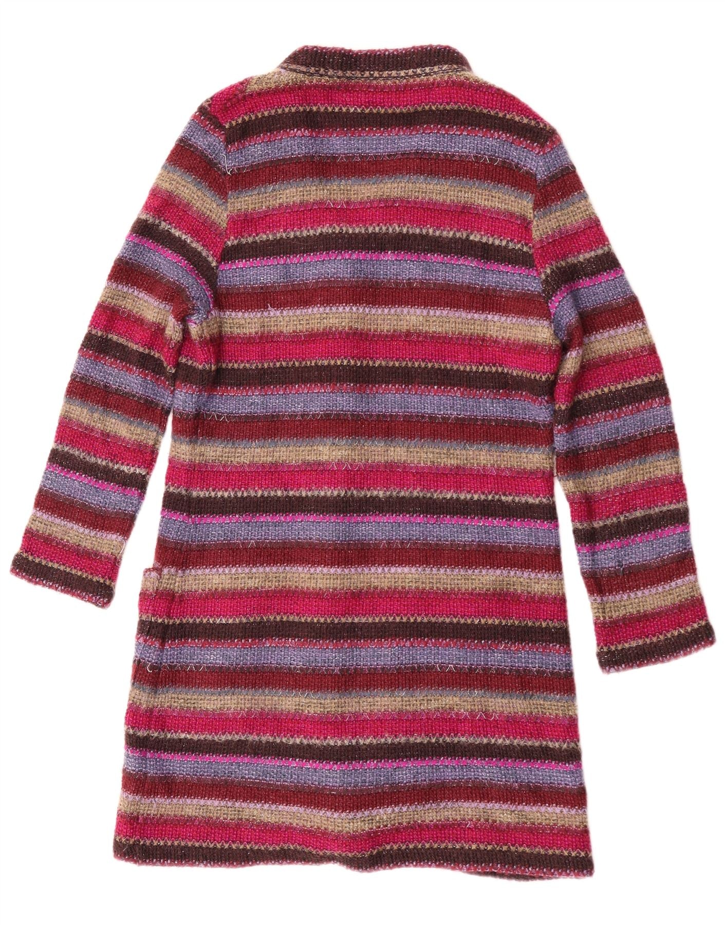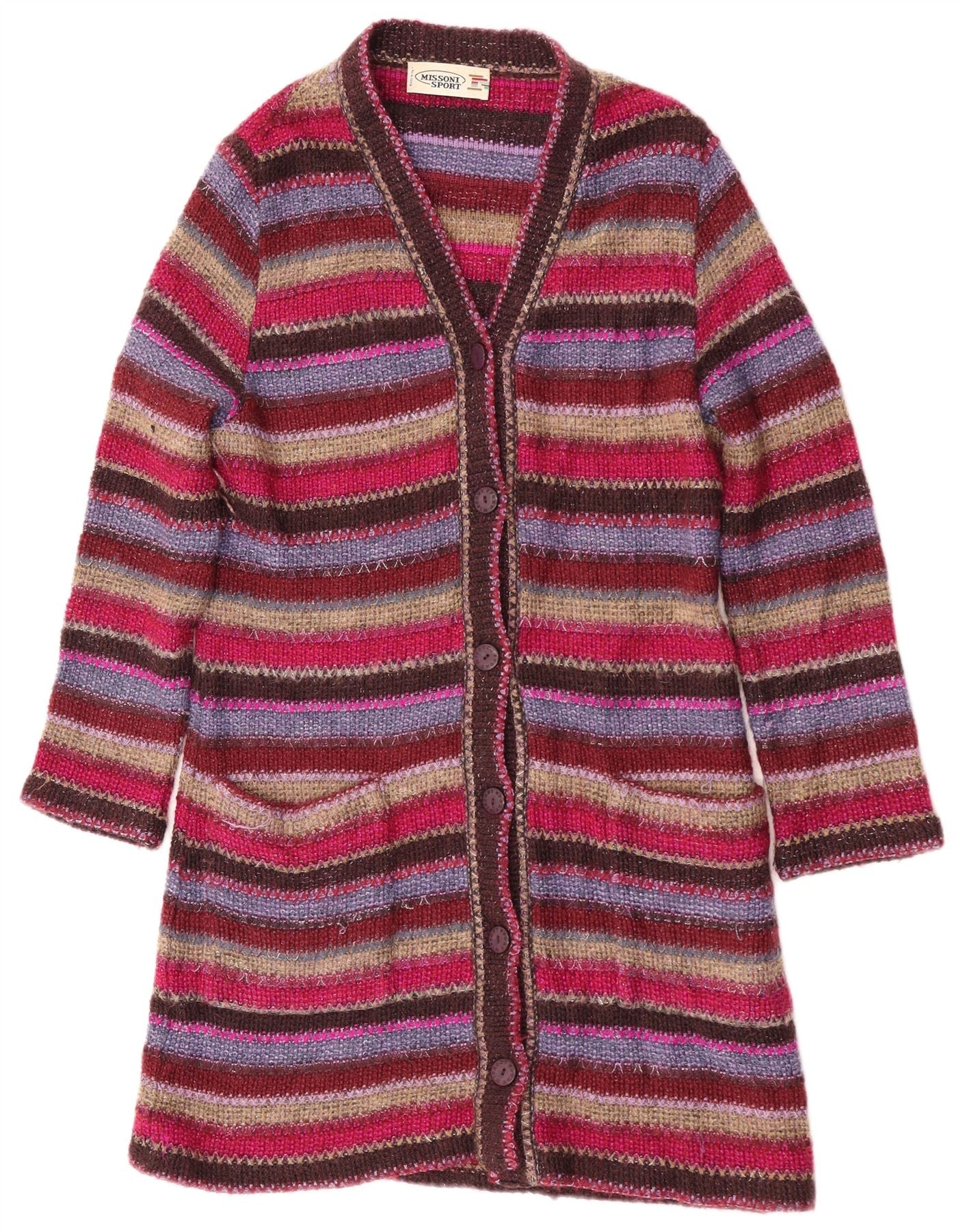 - AI Description: This Missoni Sport womens cardigan sweater is crafted from a multicoloured knit fabric, offering a rich, textured feel. It features a vibrant striped pattern in shades of red, purple, and brown. The V-neckline and button-up front create a classic silhouette. It has 3/4 length sleeves and a longline regular fit. Two front pockets add practical detail. This piece combines comfort with distinctive style.
