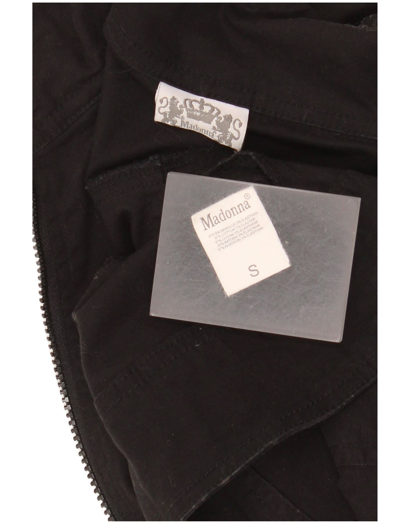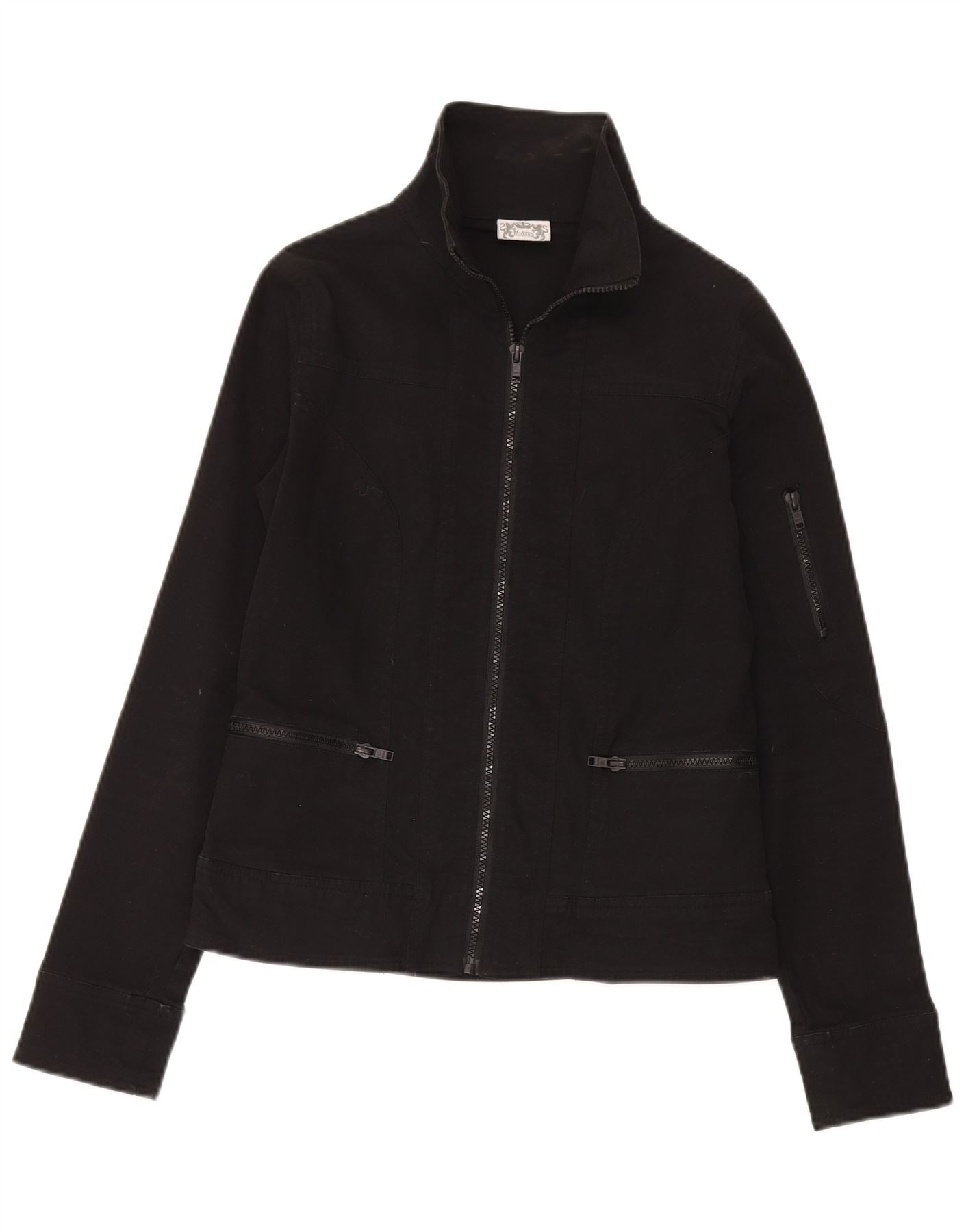 • AI Description: This Madonna womens jacket is crafted from a black cotton blend fabric with a slight stretch. It features a high neck and long sleeves. The full zip closure runs down the front. Multiple zip pockets add practical detail. The regular fit offers comfortable wear. This modern style is versatile for everyday outfitting.