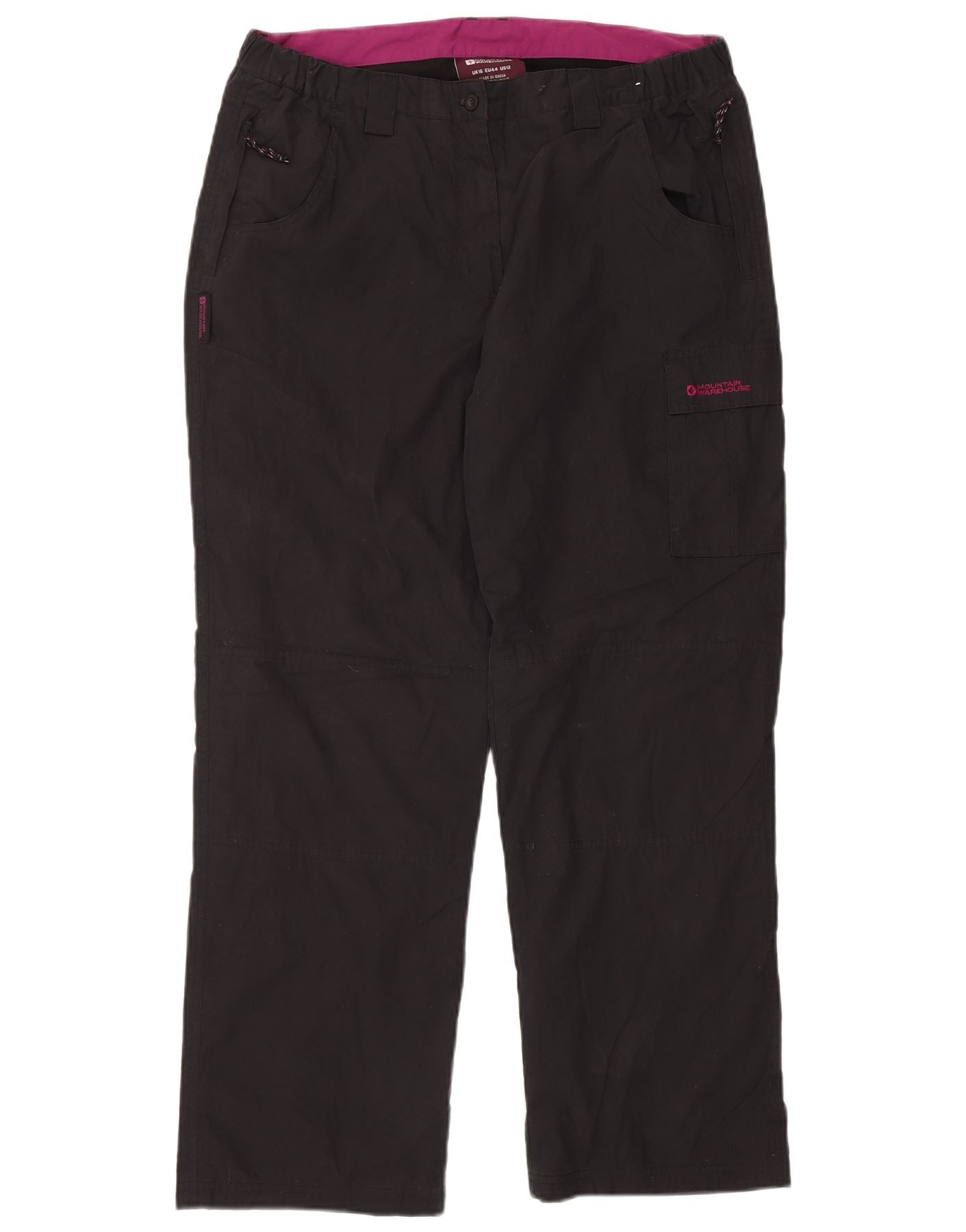 - AI Description: These Mountain Warehouse womens cargo trousers are crafted from a durable black blended fabric, offering a smooth finish. They feature a mid-rise waist with a button closure and an elasticated waistband for comfort. The regular fit ensures ease of movement. Practical zipped pockets and additional cargo pockets provide secure storage. Zips add a functional accent. Ideal for hiking and outdoor activities, combining utility with a classic design.