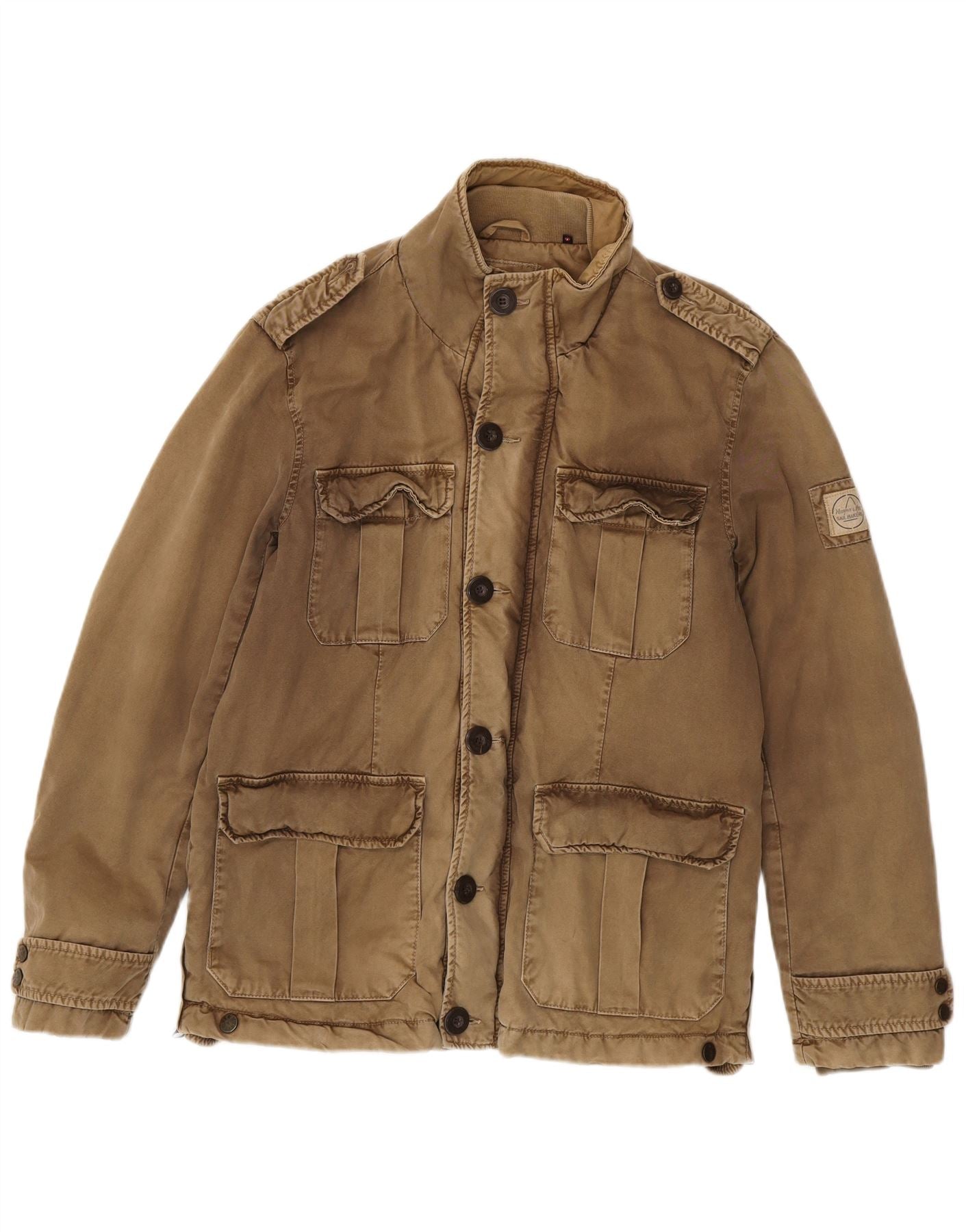 - AI Description: This Murphy & Nye mens military jacket is crafted from durable khaki waxed cotton, offering a robust, distressed finish. It features a classic collared neckline and long sleeves. The regular fit ensures comfortable wear. A full button closure secures the front. Multiple pockets add practical utility. Adjustable details enhance its authentic army style.