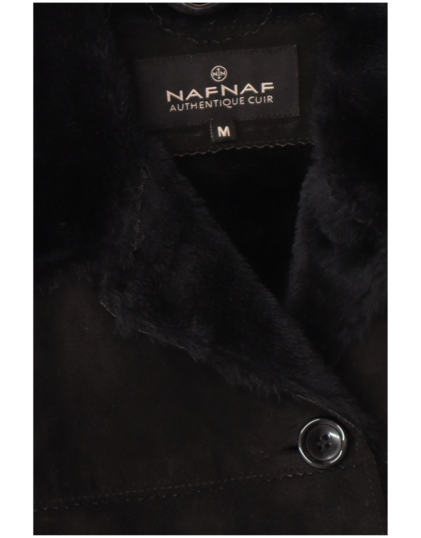 - AI Description: This Naf Naf womens shearling coat is crafted from authentic black leather with a luxurious suede finish. It features a collared neckline accented with soft fur trim for warmth and style. The long sleeves and button closure offer a classic silhouette. A belted waist creates a flattering shape, while the regular fit ensures comfort. This lined coat includes practical pockets, perfect for winter elegance.
