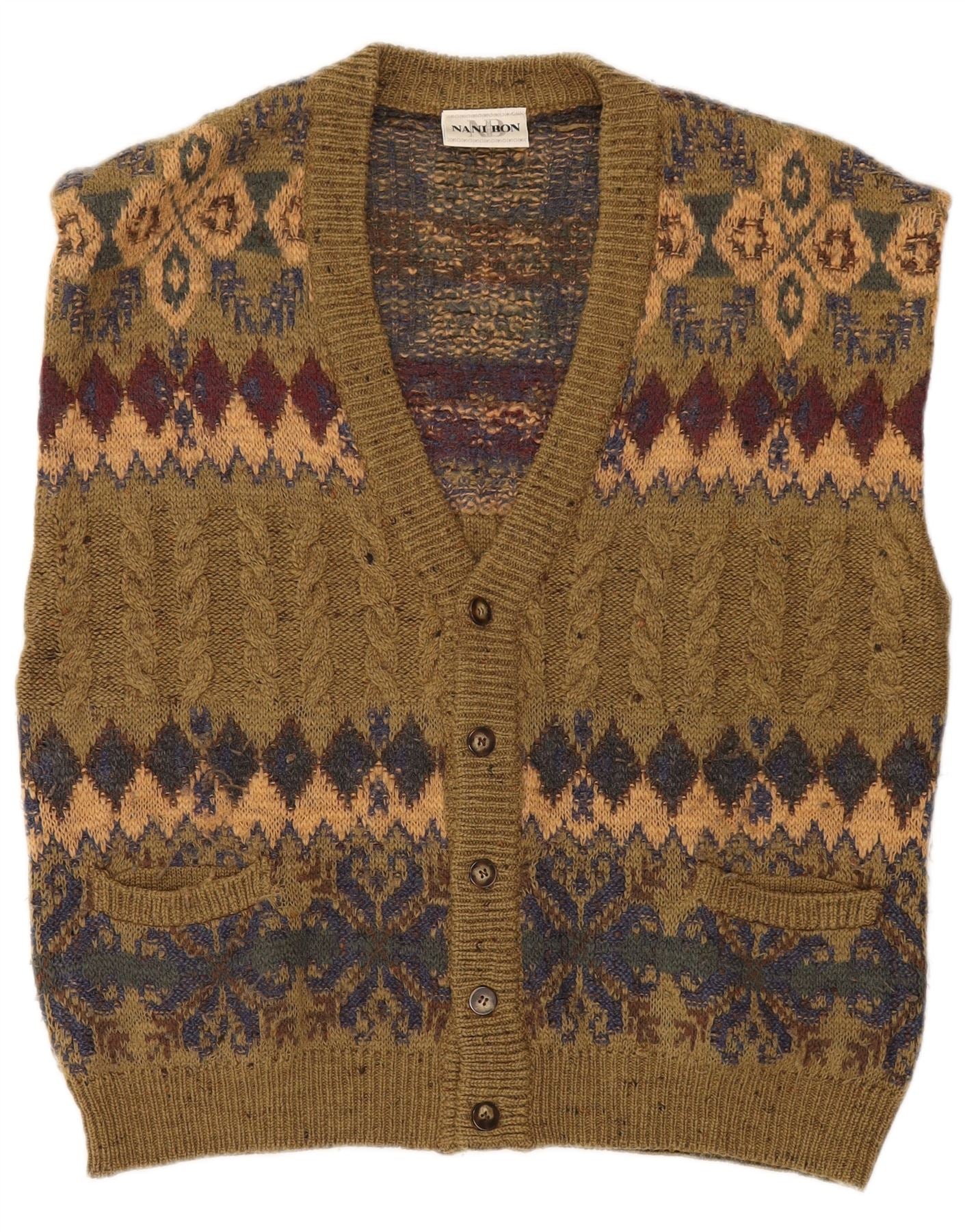 NANI BON Mens Sleeveless Cardigan Sweater IT 52 Large Khaki Fair Isle