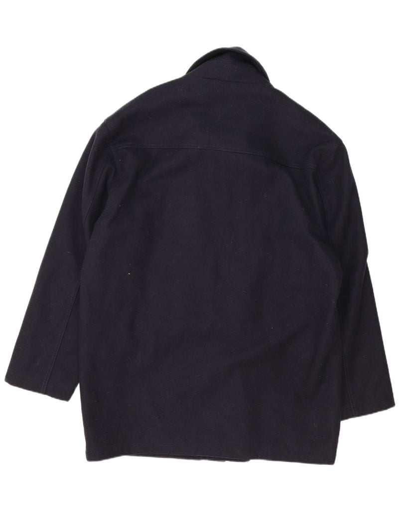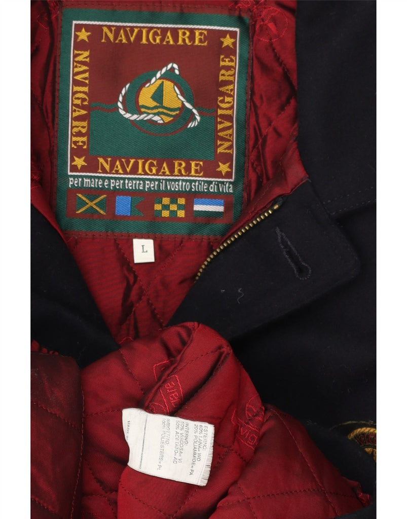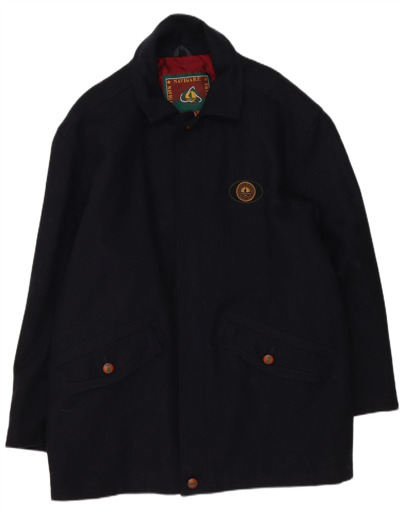 - AI Description: This Navigare mens Pea Coat is crafted from a rich navy blue wool blend, offering warmth and a refined texture. The quilted lining provides extra comfort. It features a classic collared neckline and long sleeves. The regular fit ensures a comfortable silhouette. A four button front closure adds traditional nautical style. Practical pockets and a subtle brand logo complete the design.
