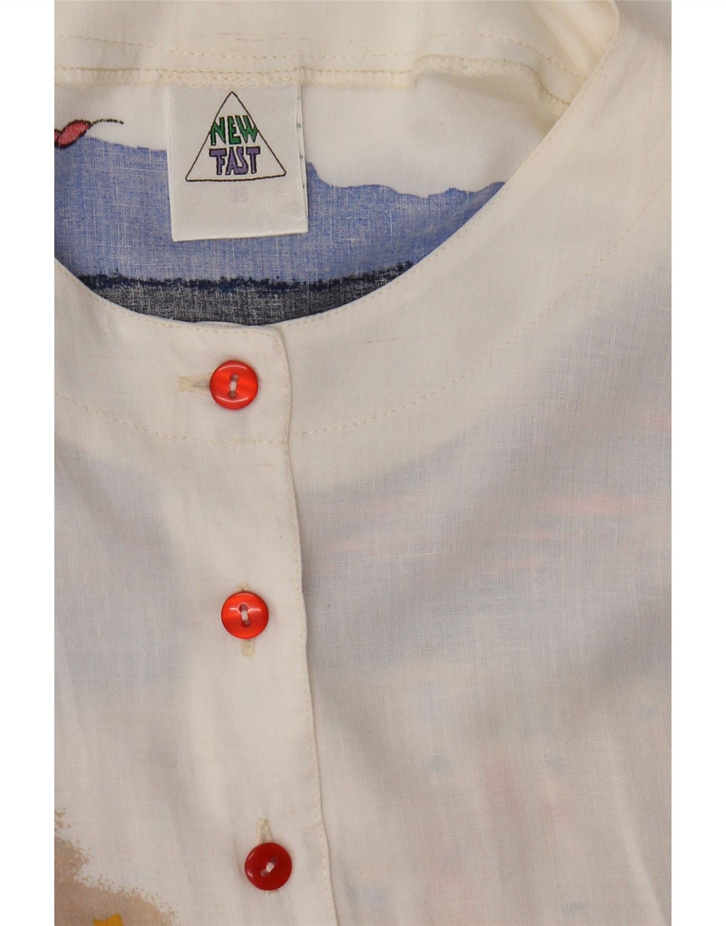 - AI Description: This New Fast women's shirt blouse is crafted from a lightweight woven fabric in an off-white hue. It features a collared neckline and short sleeves. The relaxed, loose fit ensures comfort and a breezy silhouette. A vibrant graphic print depicting a beach scene adorns the front and back. Bright red buttons provide a striking accent down the front closure.