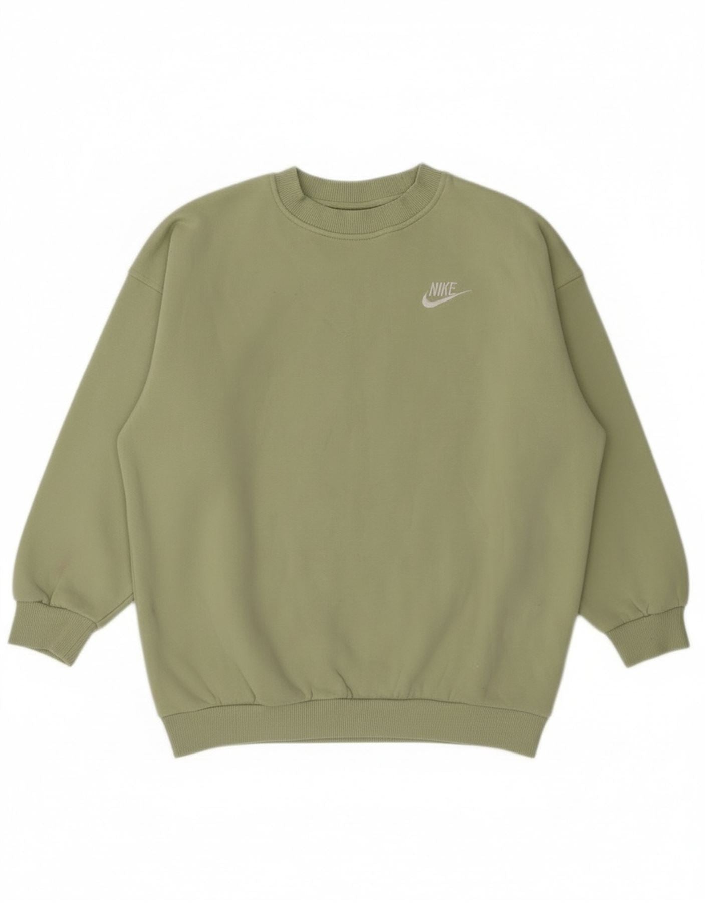 - AI Description: This Nike girls' sweatshirt jumper is crafted from soft green cotton-blend fleece for ultimate comfort. It features a classic round neck and long sleeves. The pullover design offers easy wear. Ribbed cuffs and hem provide a snug fit. A subtle Nike logo is embroidered on the chest. The regular fit ensures comfortable movement for everyday wear.