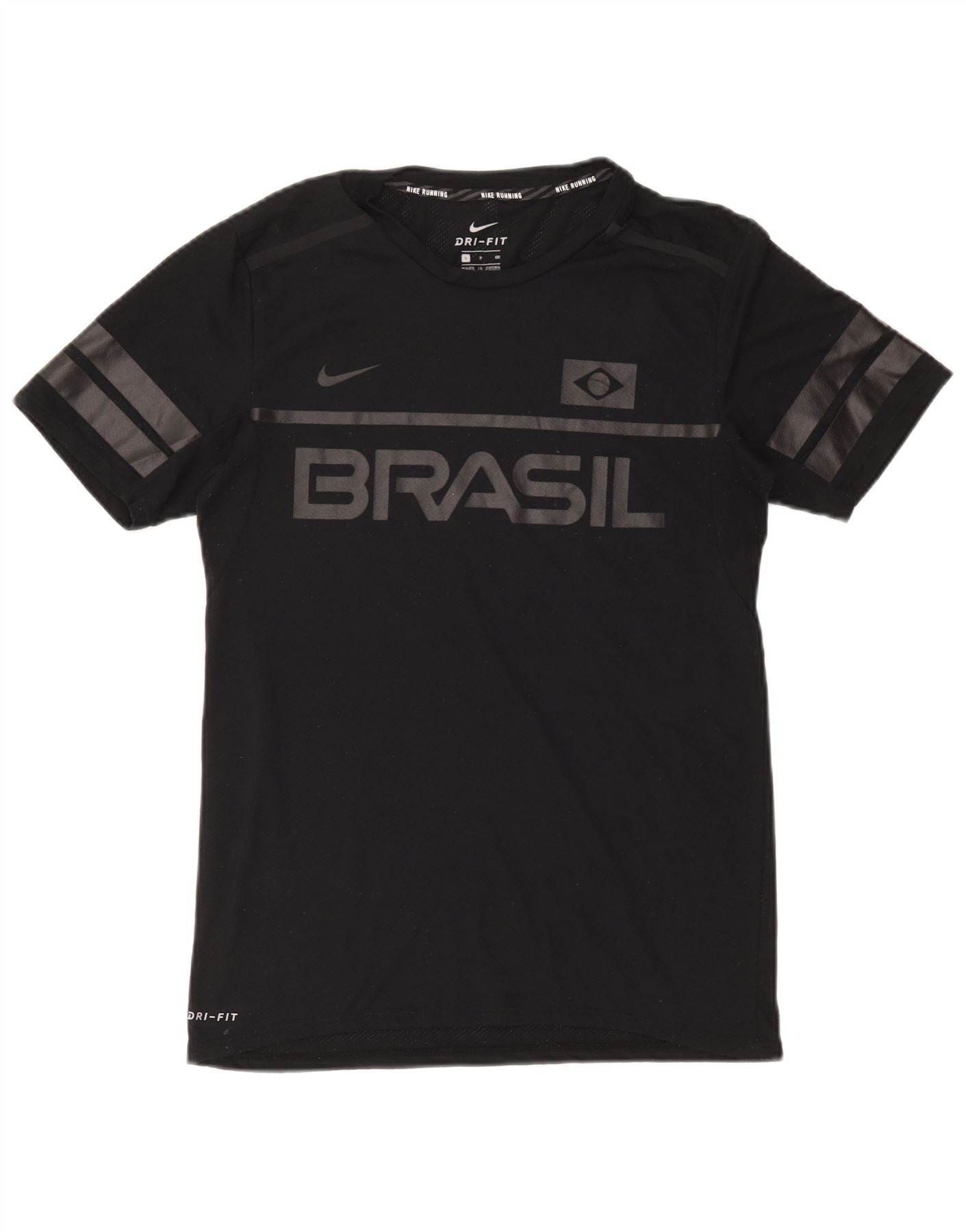 - AI Description: This Nike men's DRI-FIT Brazil T-shirt is crafted from breathable, lightweight black jersey. It features a round neck and short sleeves for a classic sports style. The regular fit ensures comfort and ease of movement. A graphic print displays the Brazil team logo. Designed with performance in mind, it's ideal for soccer.
