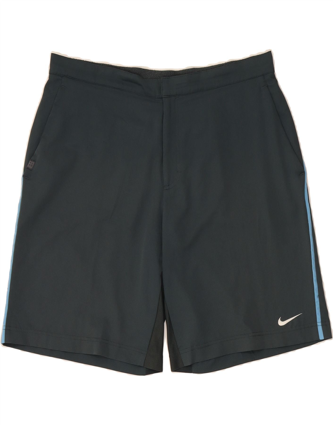 - AI Description: Nike men's sports shorts in black. Crafted from 100% polyester woven fabric with a regular fit. Features a drawstring closure, elastic waist, and pockets. Pre-owned in excellent condition with minor loose stitching on the waistband and wear on the label. Washing Instructions: WASH WITH LIKE COLORS/DO NOT USE SOFTENERS. Size L. Made in Vietnam.