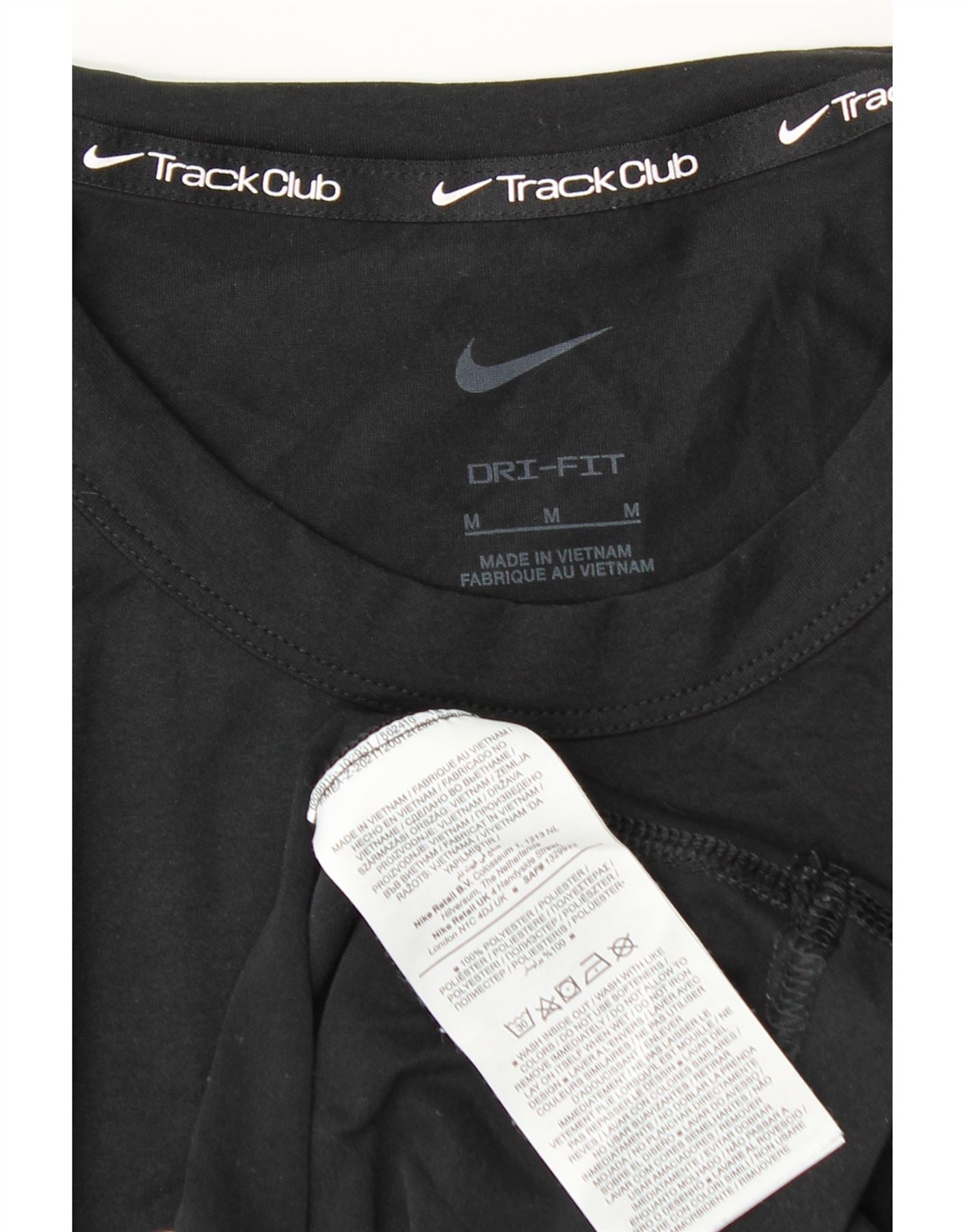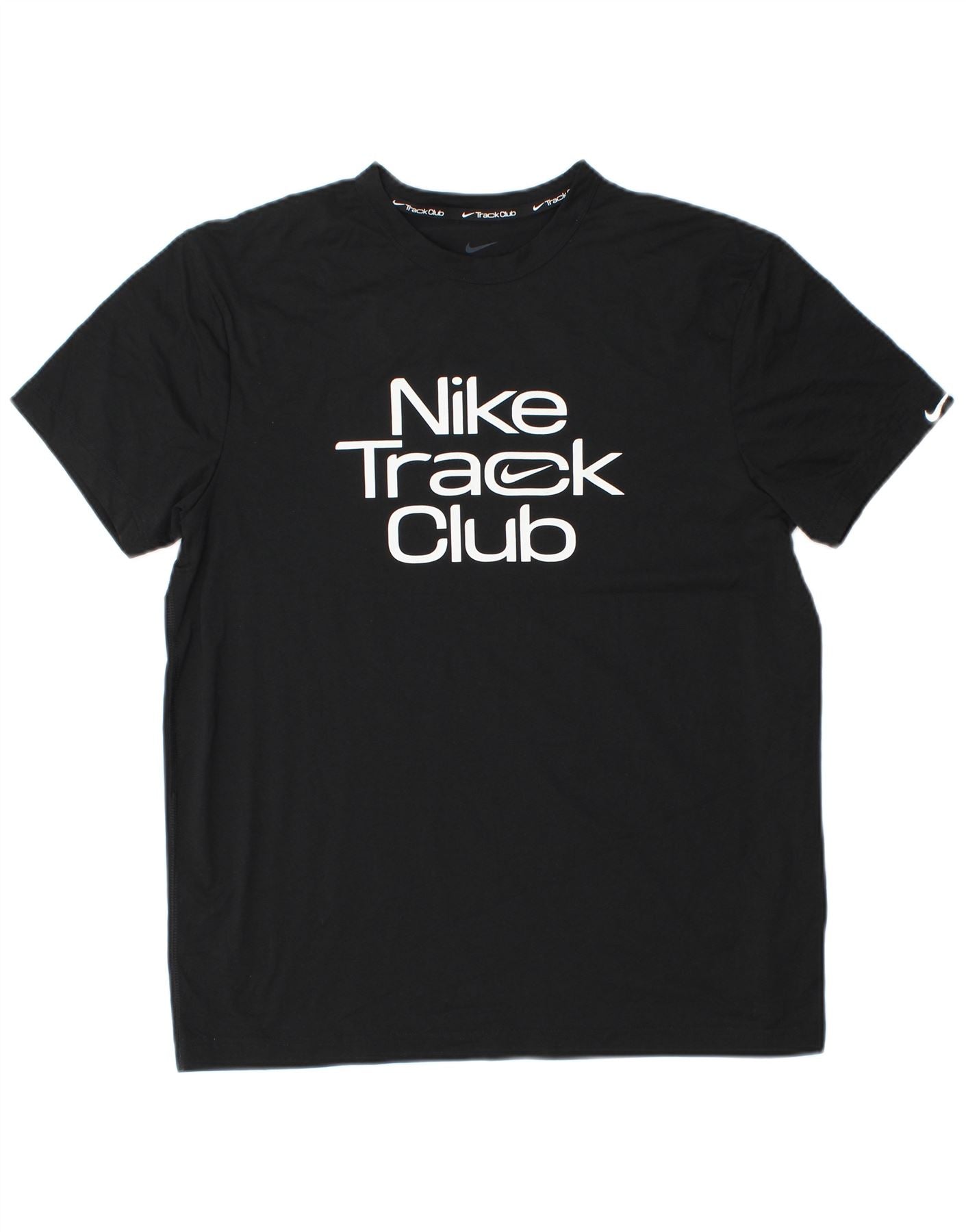 - AI Description: This Nike mens Graphic T-Shirt Top is crafted from 100 percent polyester knit fabric. It features Nike Dri-Fit technology for a breathable, lightweight feel. The pullover design has a classic round neck and short sleeves. Its athletic fit ensures comfort and freedom of movement. A prominent Nike Track Club logo graphic adorns the front. This sports style top is ideal for running and performance.