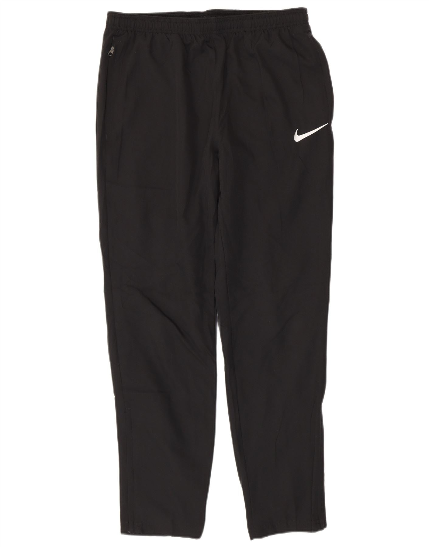 - AI Description: This Nike mens tracksuit trousers are crafted from black woven polyester, offering a smooth and durable finish. The pull on style features an elastic waist for a comfortable, secure fit. Zipped pockets provide practical storage. A subtle Nike logo adds a signature athletic touch. The regular fit ensures ease of movement, perfect for sports or casual wear.
