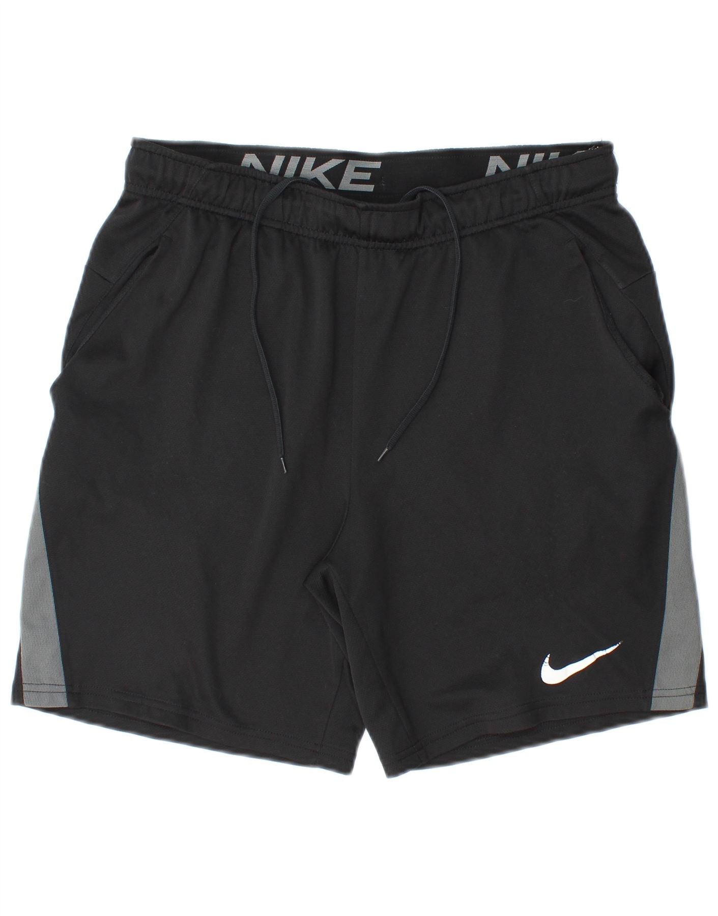 - AI Description: This Nike men's shorts are crafted from breathable black jersey fabric, featuring Dri-Fit technology for comfort. The elasticated waistband with a drawstring closure ensures a secure, adjustable fit. A regular cut offers ease of movement for training. Colourblock grey panels on the sides add a dynamic touch. The iconic Nike logo is subtly placed, completing the sporty design.