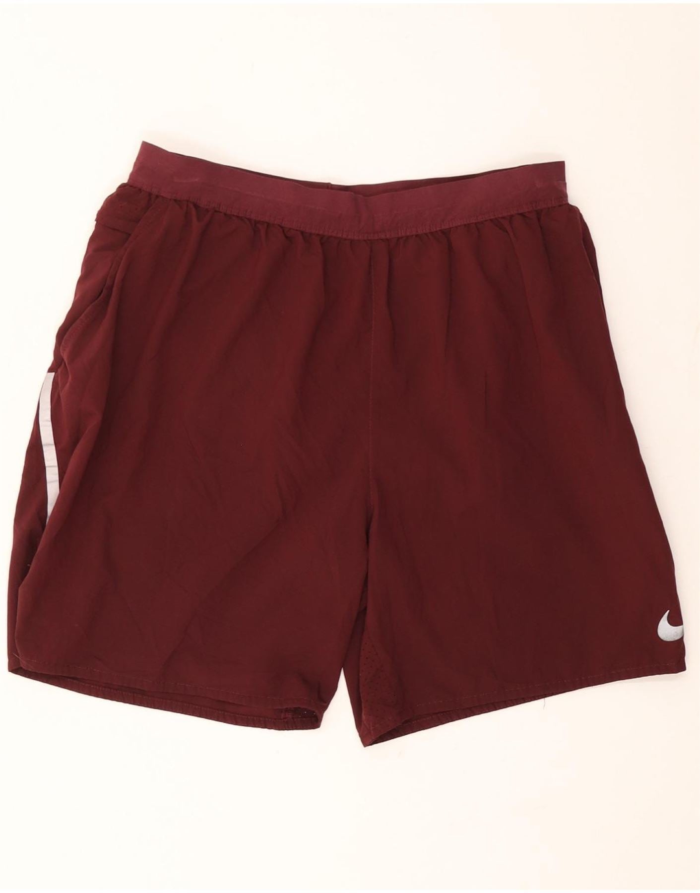 - AI Description: This Nike men's casual shorts are crafted from a breathable maroon blended fabric, featuring Nike's Dri-FIT technology. They boast an elasticated waist for a comfortable pull-on fit. The regular athletic cut ensures optimal ease of movement. A subtle white stripe detail runs down the side, complemented by the iconic Nike logo on the leg. Ideal for running, these shorts combine comfort with performance.