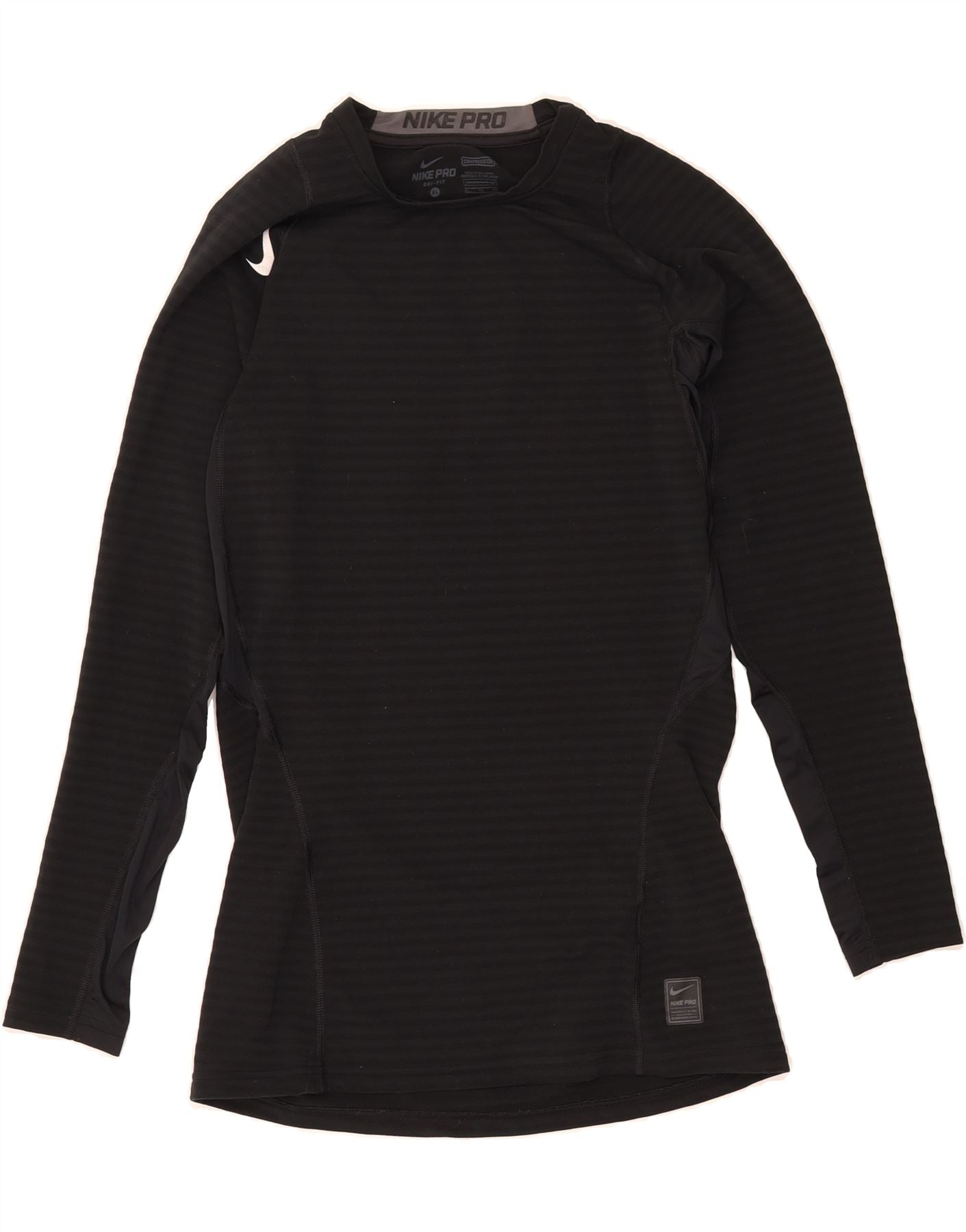 - AI Description: This pre-owned Nike boys' long-sleeved sports top is crafted in a breathable, stretch knit fabric. Featuring a slim fit and round neck, this black top offers comfort and flexibility. Composition: 83% Polyester/17% Elastane (body), 79% Polyester/21% Elastane (panels). Minor loose stitching at the collar and visible wear on the label are present. Size XL. Made in Sri Lanka.