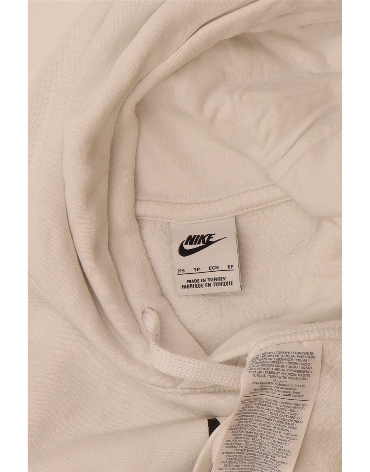 - AI Description: This Nike mens Hoodie Jumper is crafted from a soft off white cotton blend fleece. It features a comfortable hooded neckline with a drawstring closure. Long sleeves and a regular fit ensure ease of movement. A prominent graphic logo adorns the front, adding a signature athletic touch. The pullover style includes a practical kangaroo pocket for added utility.