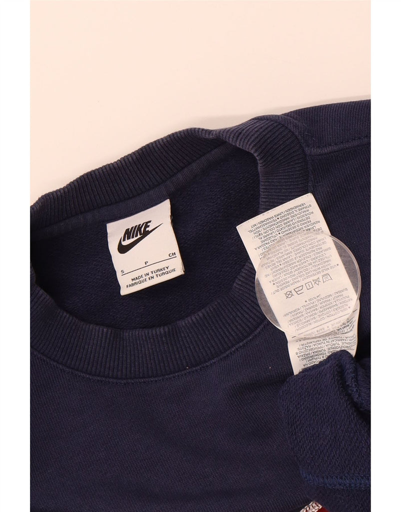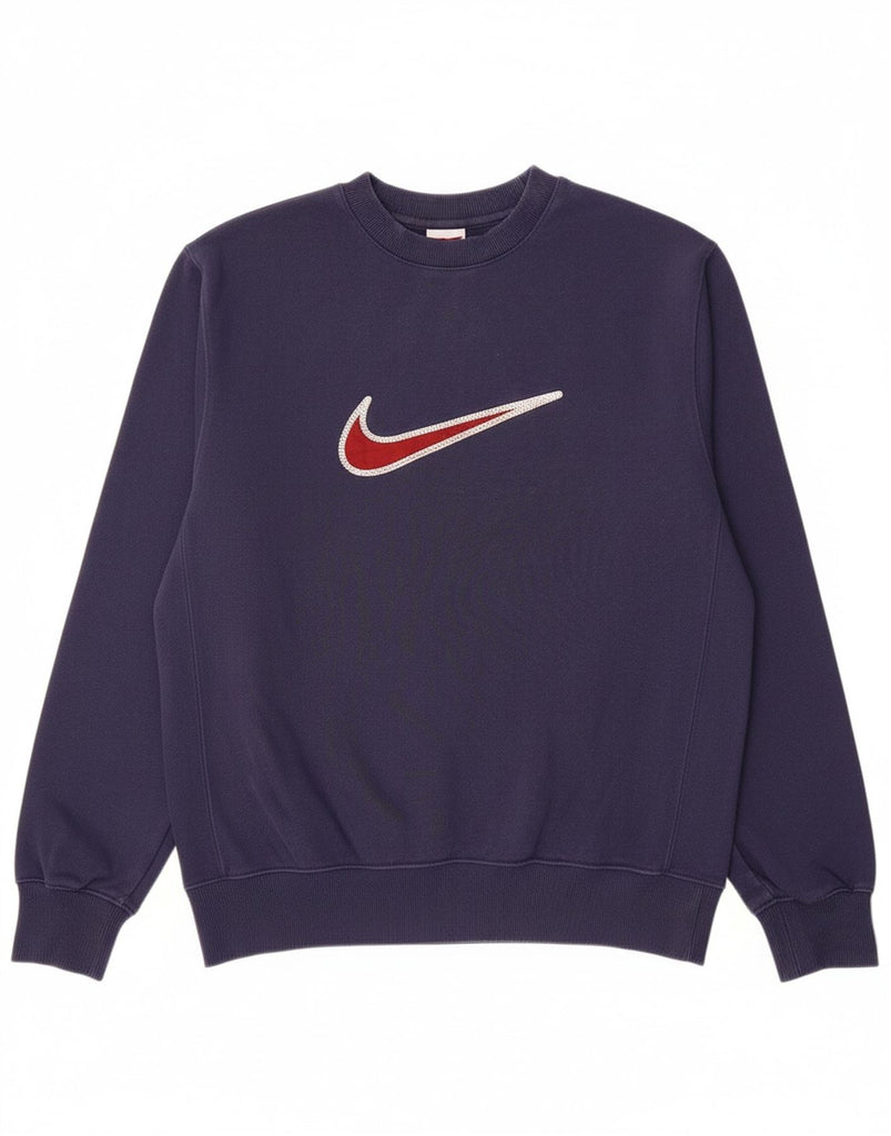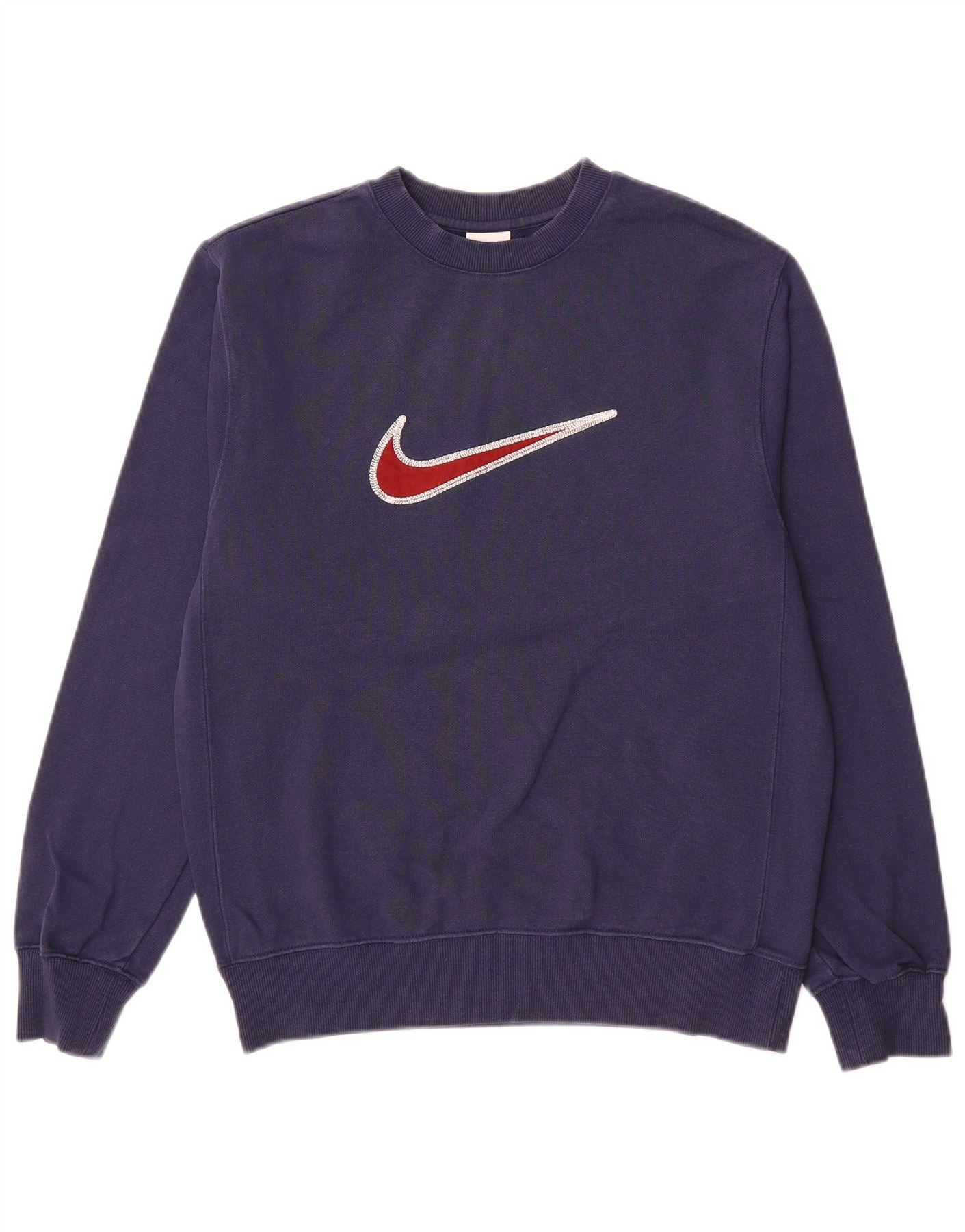 - AI Description: This Nike mens sweatshirt jumper is crafted from a comfortable navy blue cotton blend knit. It features a classic round neck and long sleeves. The pullover design offers a regular fit for ease of wear. A subtle logo accent adds a signature sporting touch. This garment provides comfort and a standard fit, ideal for sports or casual styling.