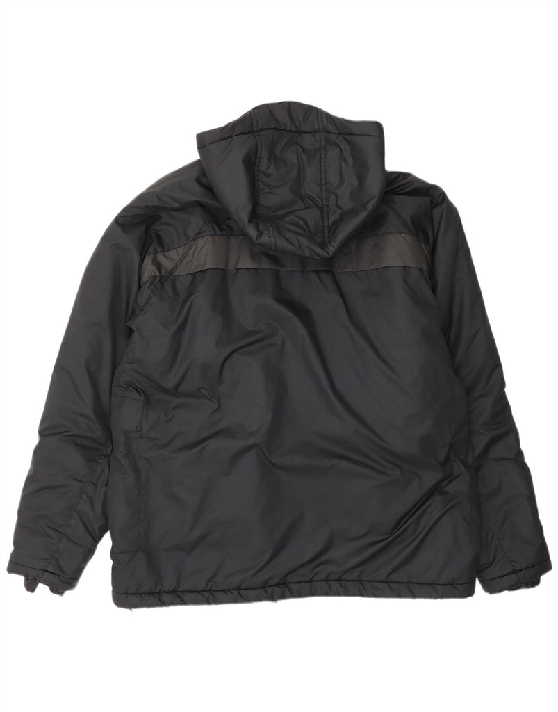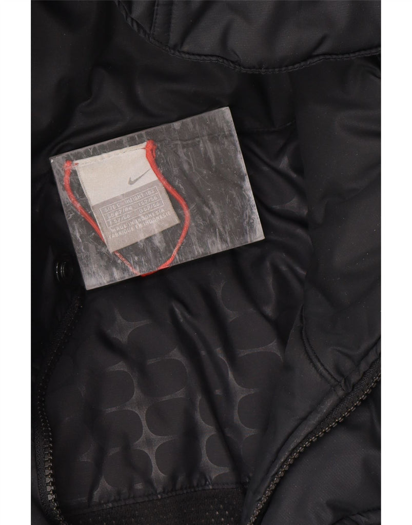 - AI Description: This Nike mens padded jacket offers warmth and protection in a classic black finish. Crafted from a woven fabric with insulation, it provides a comfortable regular fit. The collared neckline and full zip closure ensure a secure feel. It features a practical hood, multiple pockets, and is windproof for outdoor activities. A subtle logo accent completes the design.