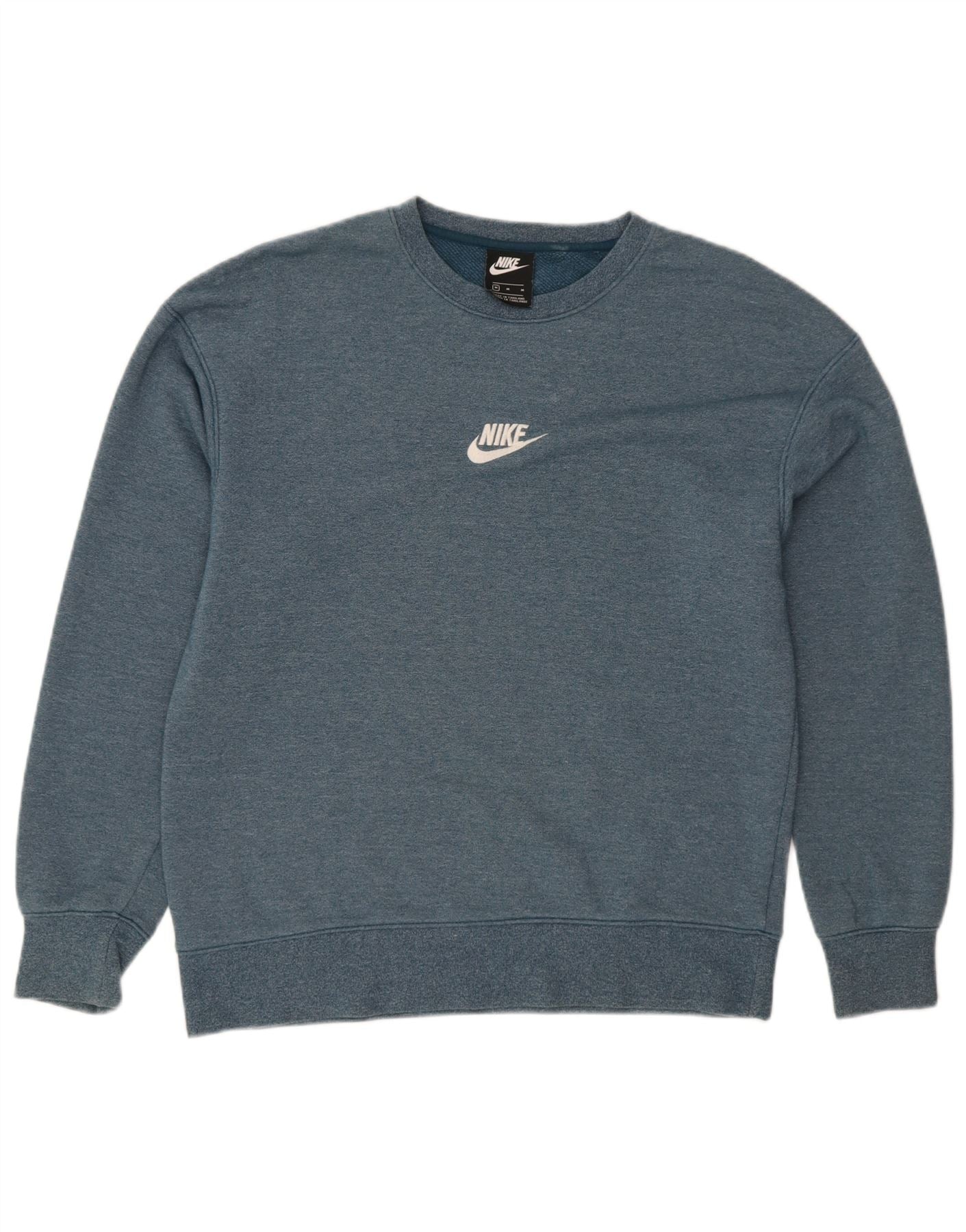 - AI Description: This Nike mens sweatshirt jumper is crafted from a comfortable blue cotton blend jersey fleece. It features a classic round neck and long sleeves with cuffed detailing. The pullover design offers a regular fit for everyday comfort. A subtle white Nike logo on the chest adds a signature branded touch.
