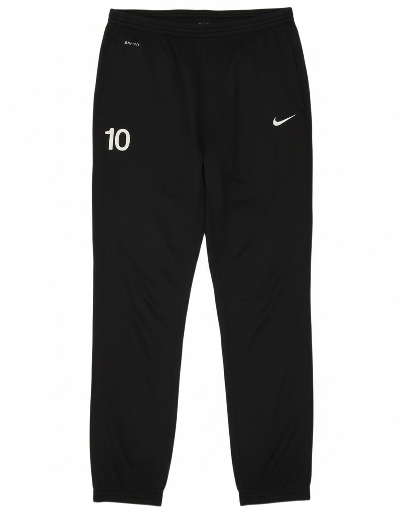 - AI Description: This Nike mens tracksuit trousers joggers are crafted from 100 percent polyester jersey fabric, offering a smooth and windproof finish. They feature an elasticated pull on waist for comfort and an athletic regular fit. Zipped pockets provide secure storage. A prominent Nike logo and the number 10 adorn the design. Ankle zips allow for easy adjustment. Ideal for football and sports, these trousers combine practicality with a sleek black aesthetic.