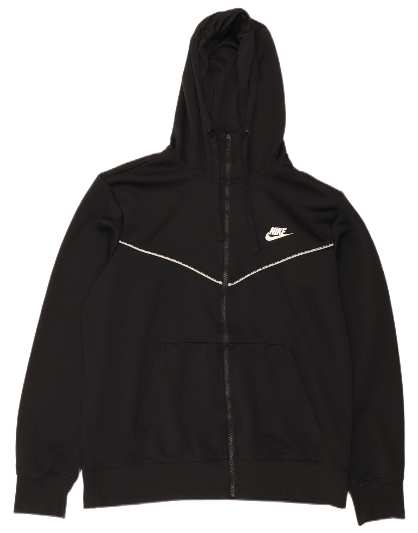 - AI Description: This Nike mens zip hoodie sweater is crafted from smooth black polyester jersey. It features a full zip closure and a high neck, leading to a practical hood. Long sleeves and a regular fit ensure comfortable wear. The iconic Windrunner chevron graphic across the chest adds a distinctive sports detail. Two front pockets offer functionality. A subtle Nike logo completes the design.