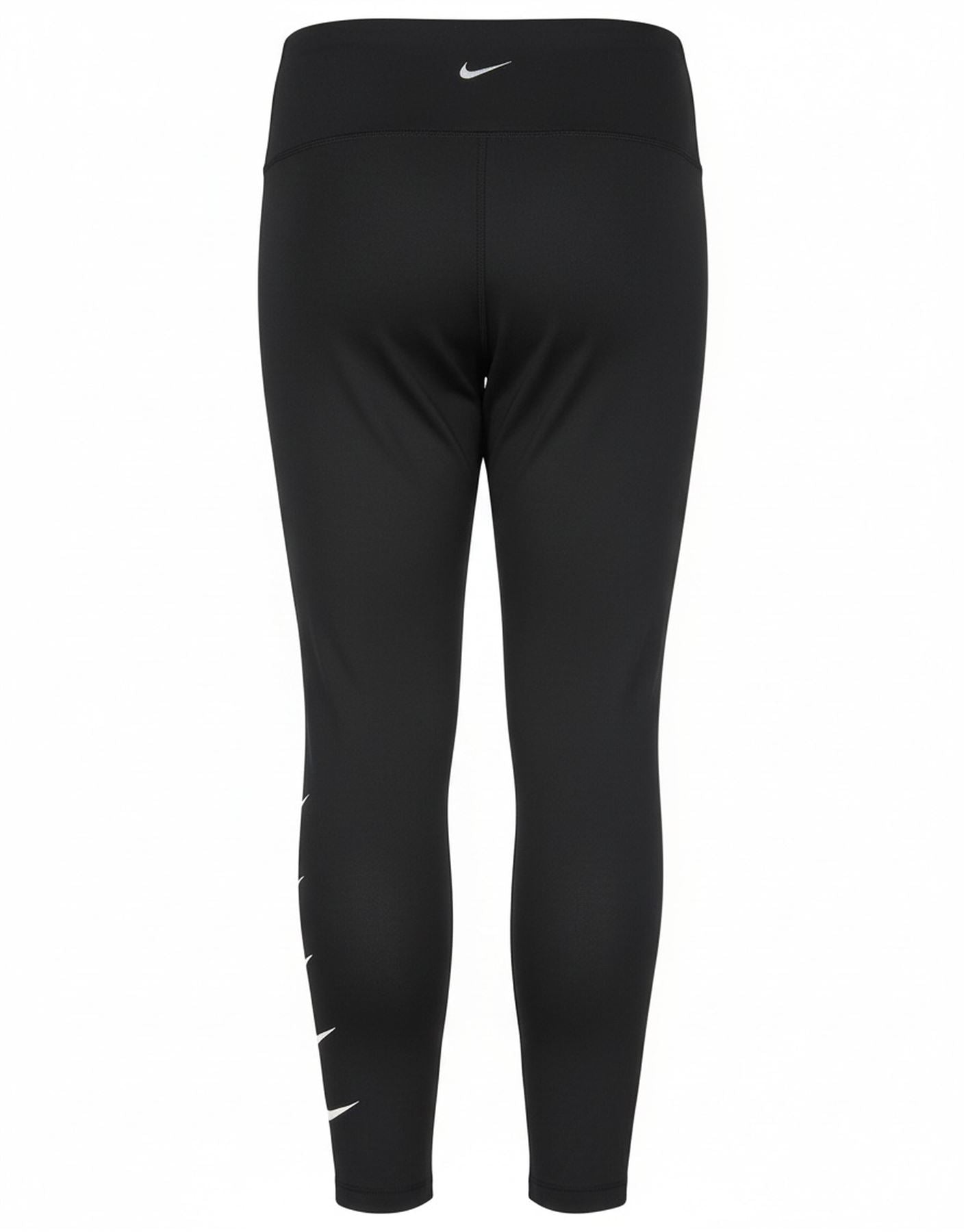 - AI Description: These Nike womens leggings are crafted from a smooth stretchy polyester blend for ultimate comfort. The Dri-Fit fabric wicks moisture effectively. They feature a pull-on design with a comfortable waistband. The slim athletic fit tapers neatly down the leg. A bold graphic of multiple white Nike swoosh logos adorns one leg. This adds a distinctive sporty accent. Designed for performance these black leggings offer both style and functionality.