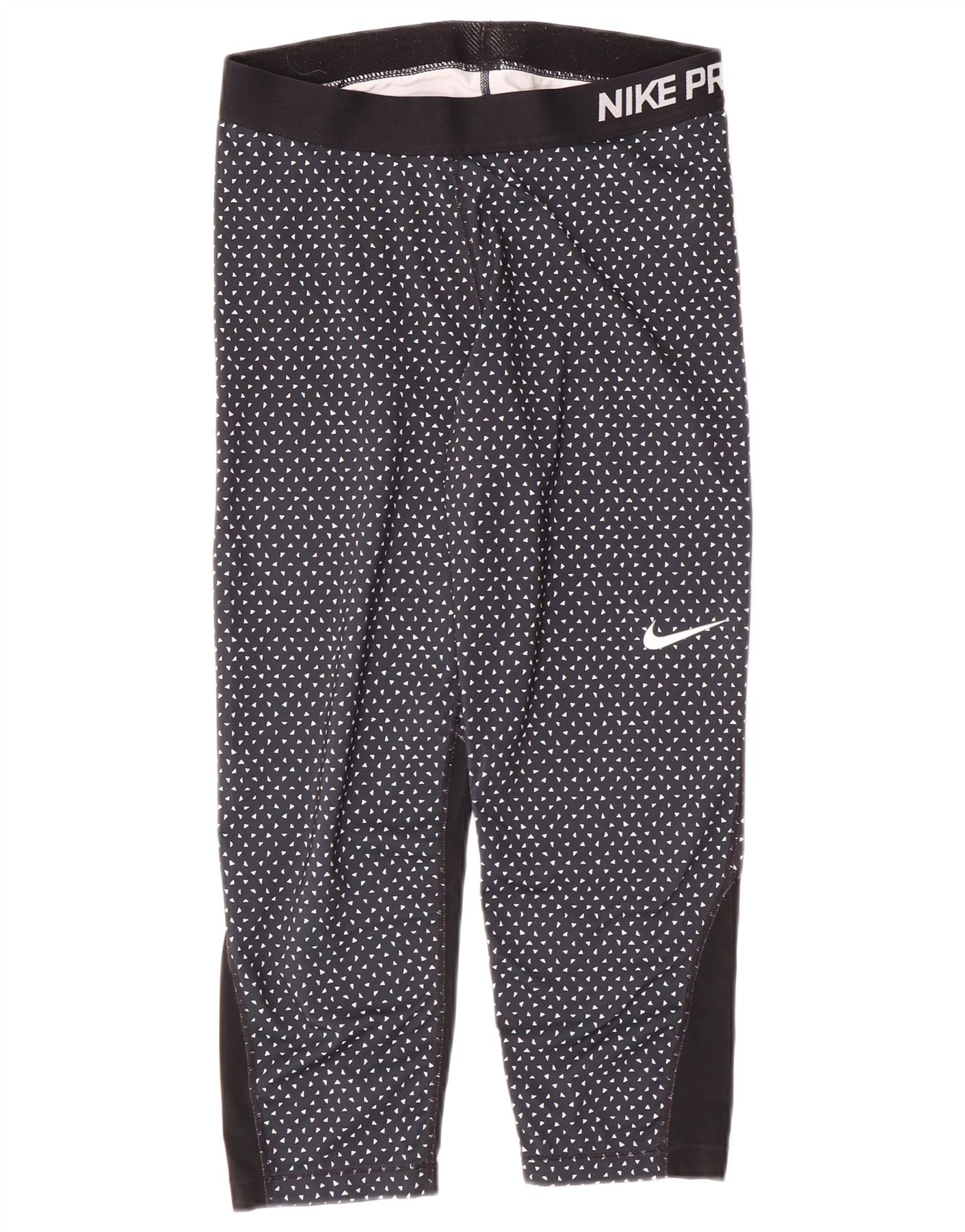 - AI Description: These Nike Pro women's running leggings are made from a smooth polyester and elastane blend. They feature a slim fit and a pull-on closure for ease of wear. The fabric is breathable and stretchy, designed for performance. A spotted pattern adds a graphic detail to the black fabric. These capri-length leggings are ideal for running and sports activities.