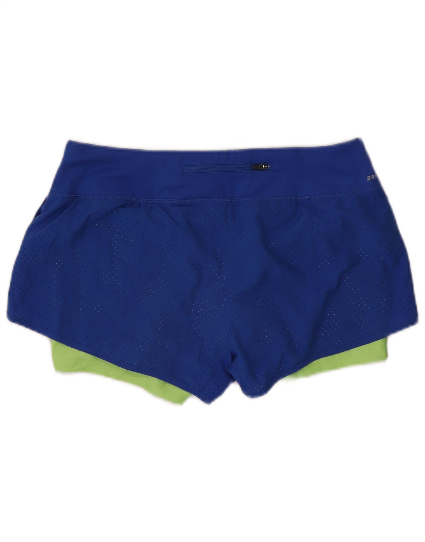- AI Description: These Nike women's running shorts are crafted from breathable polyester blended fabric. The outer layer features a mesh texture. They offer an athletic comfort fit with a pull-on elastic waistband. The design includes an inner lining for support. A vibrant blue colourblock outer layer contrasts with a lime green inner. Zipped pockets provide practical storage. A subtle Nike logo completes the look.
