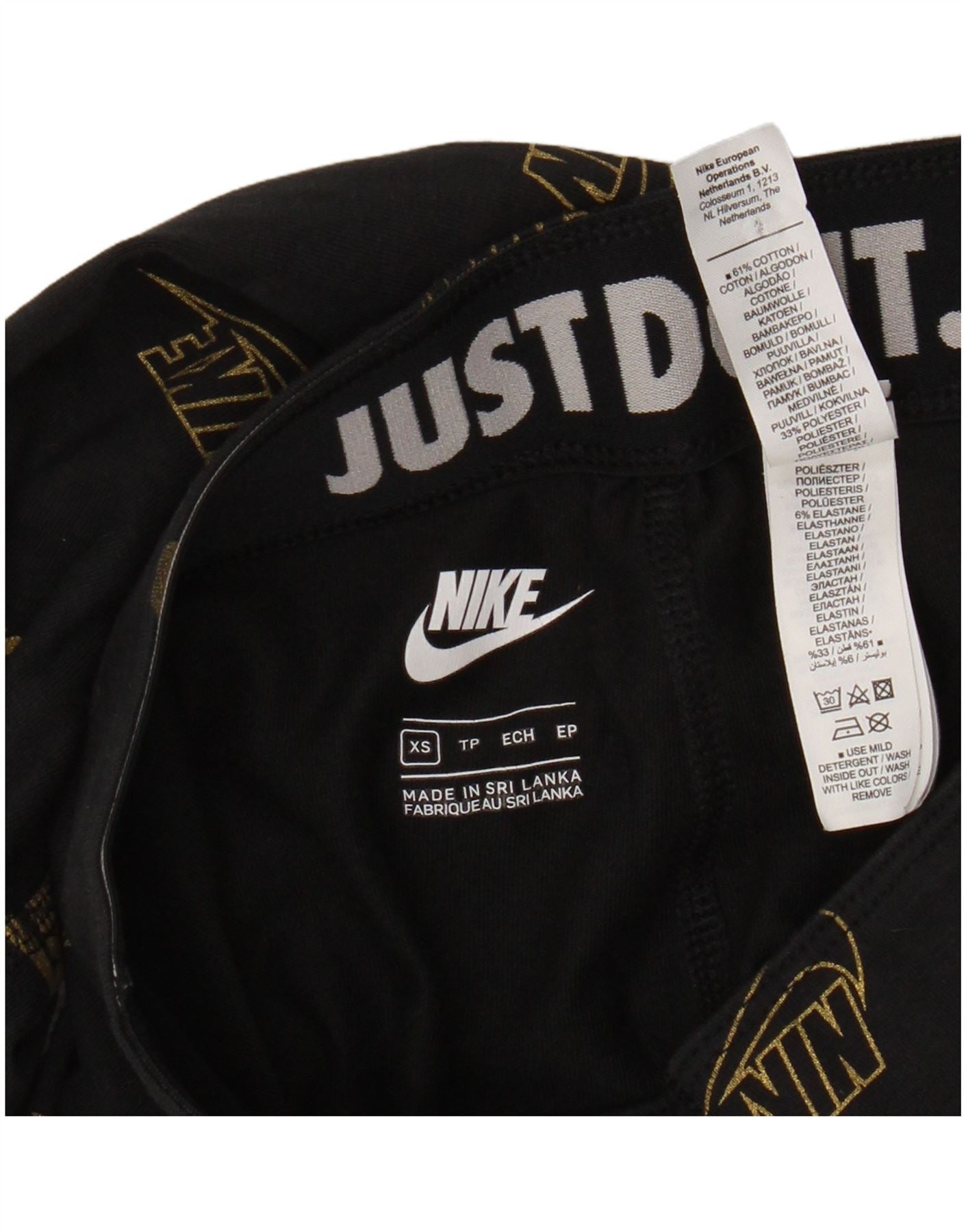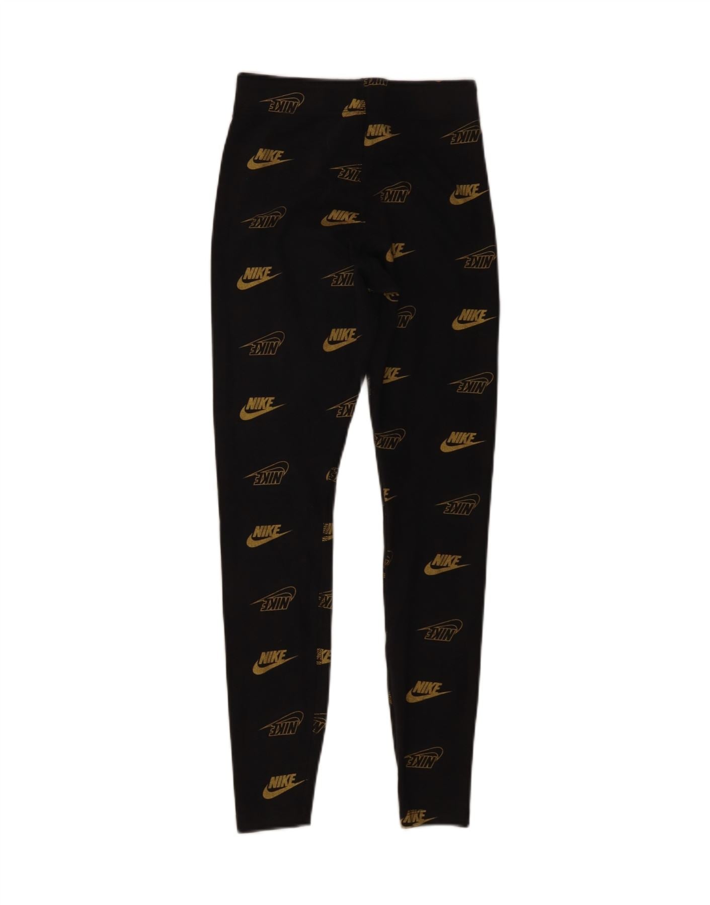 - AI Description: These Nike womens leggings are crafted from a comfortable cotton blend fabric with stretch. They feature a pull-on design and an elasticated waist for a secure, slim fit. The black fabric is adorned with a striking gold repeating Nike logo and Just Do It graphic. These leggings offer both style and flexibility for training or casual wear.