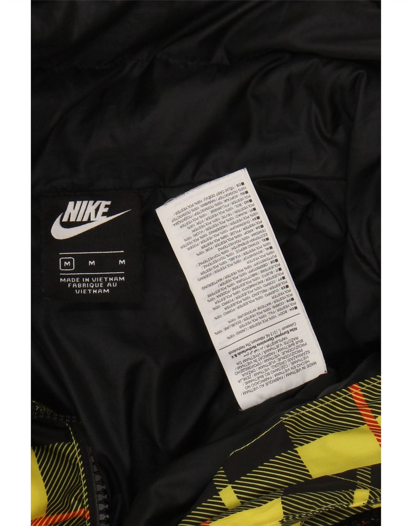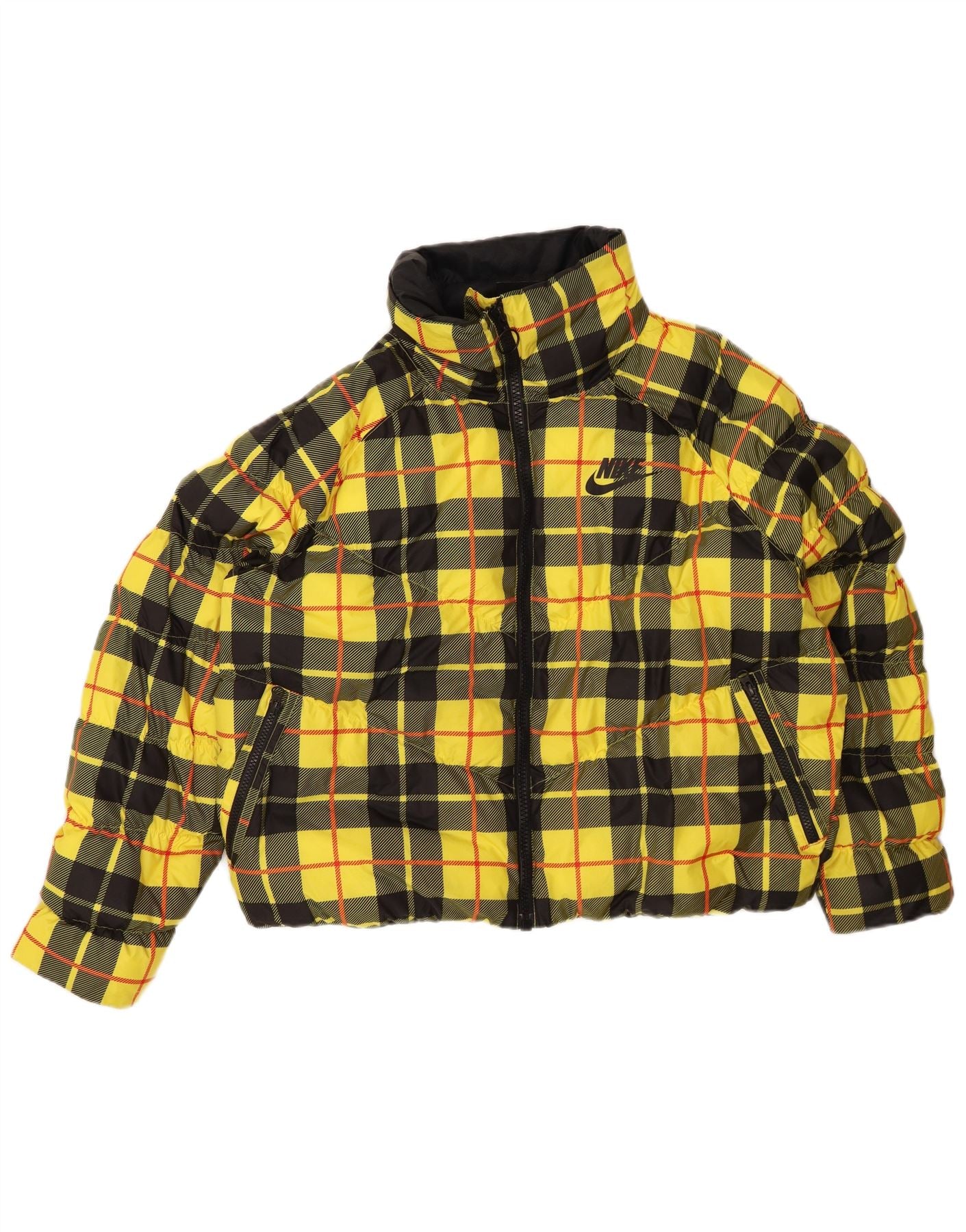 - AI Description: This Nike womens padded jacket is crafted from woven polyester, offering a padded, warm feel. It features a striking multicoloured plaid pattern, blending yellow, black, and grey tones. The high neck and long sleeves provide ample coverage. A full zip closure ensures easy wear. Practical pockets add functionality. The regular fit offers comfortable wear, complete with a subtle brand logo accent.