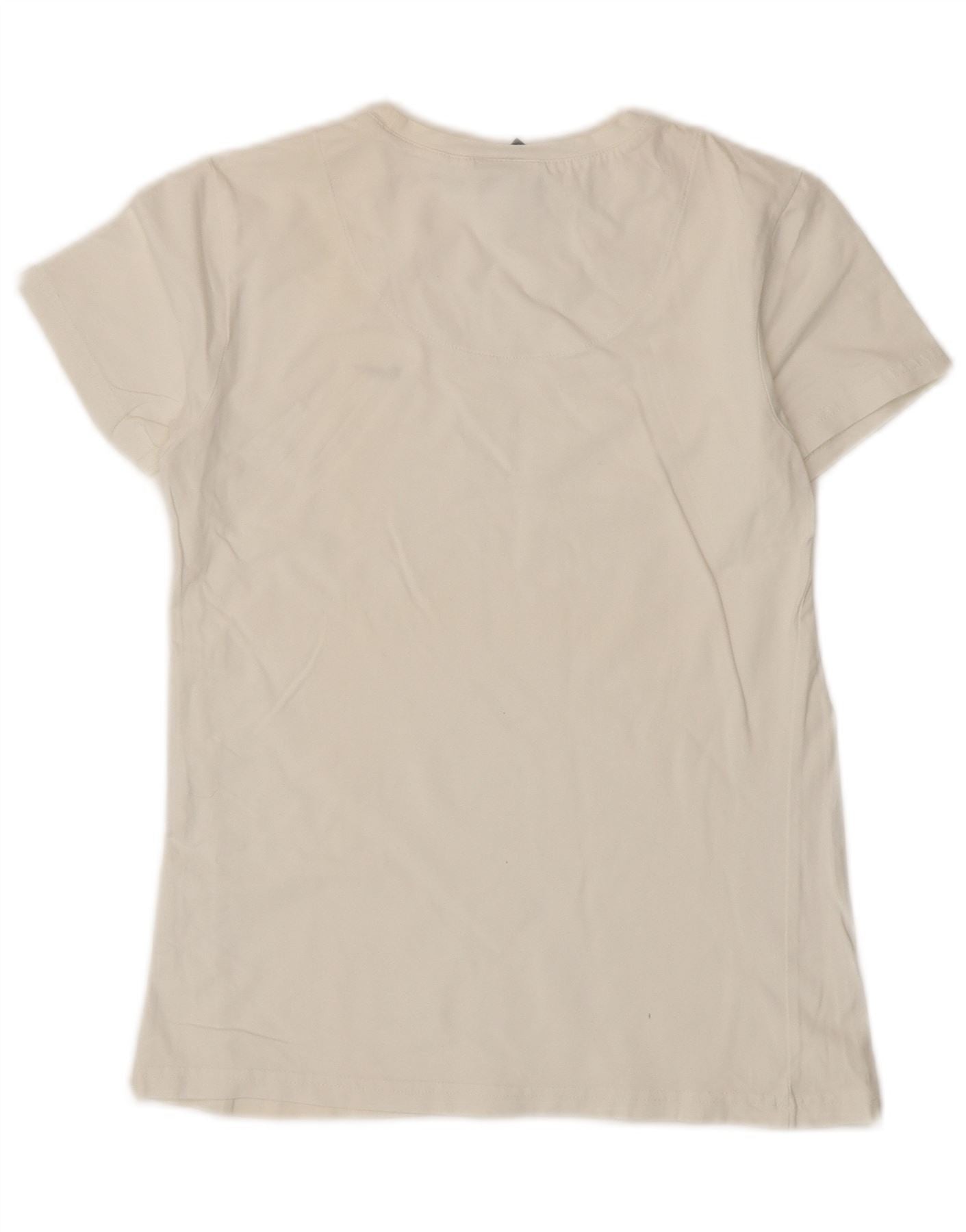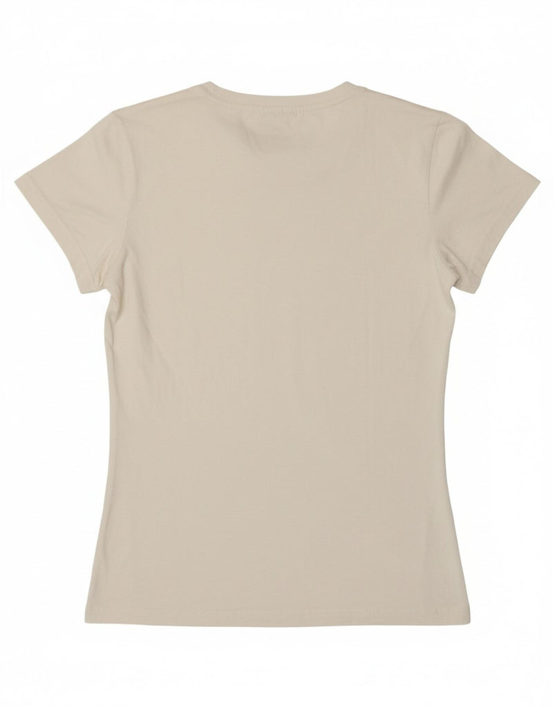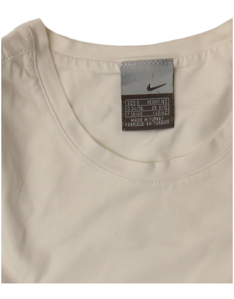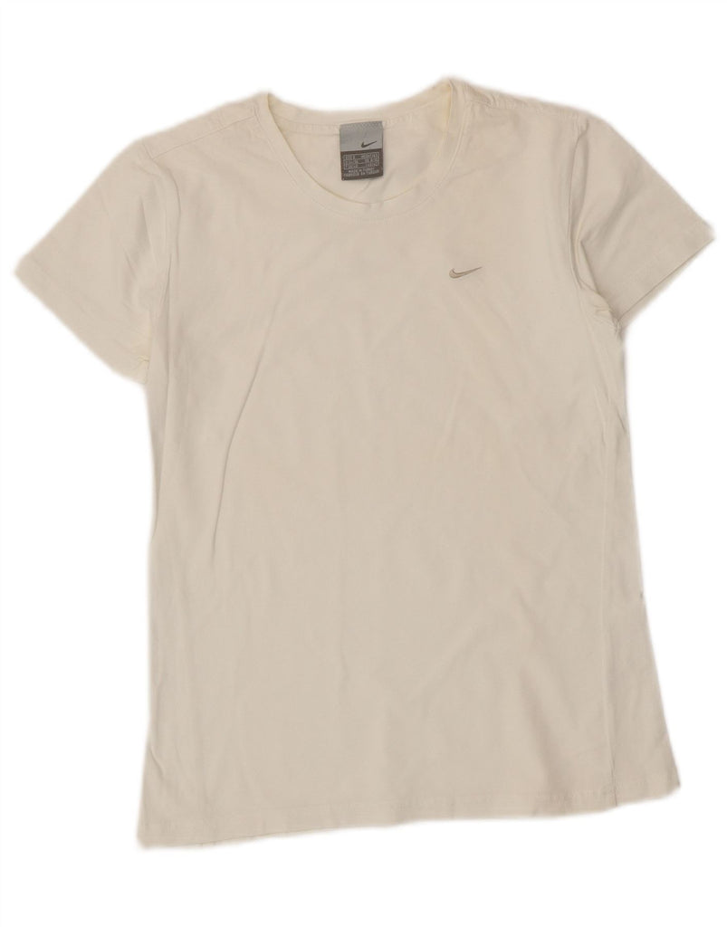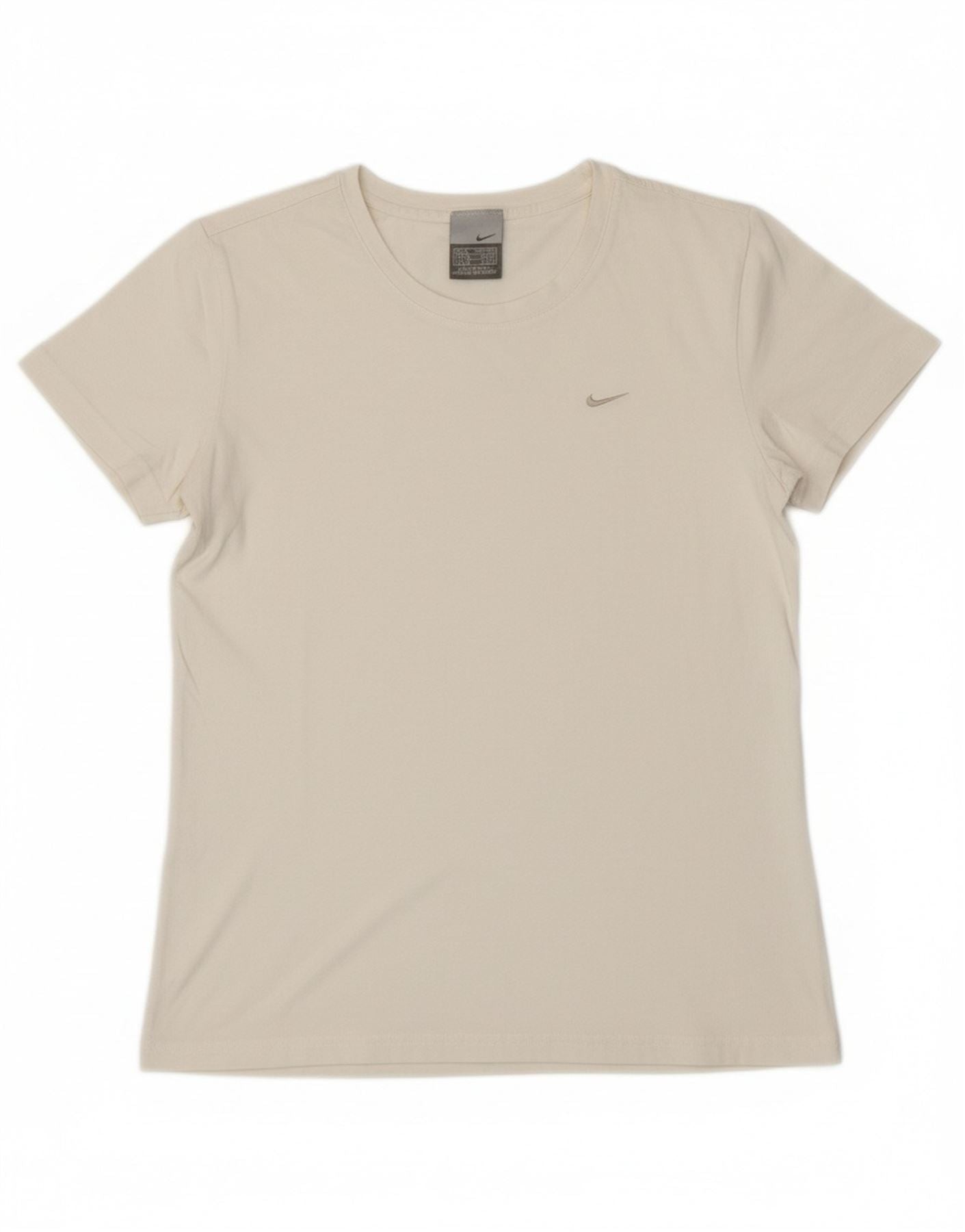 - AI Description: This Nike womens T-Shirt top is crafted from soft off-white knit jersey. It features a classic round neck and short sleeves, providing a comfortable and versatile silhouette. The regular fit ensures ease of movement. A subtle branded logo offers a refined, signature detail. This top is perfect for sports or casual wear.