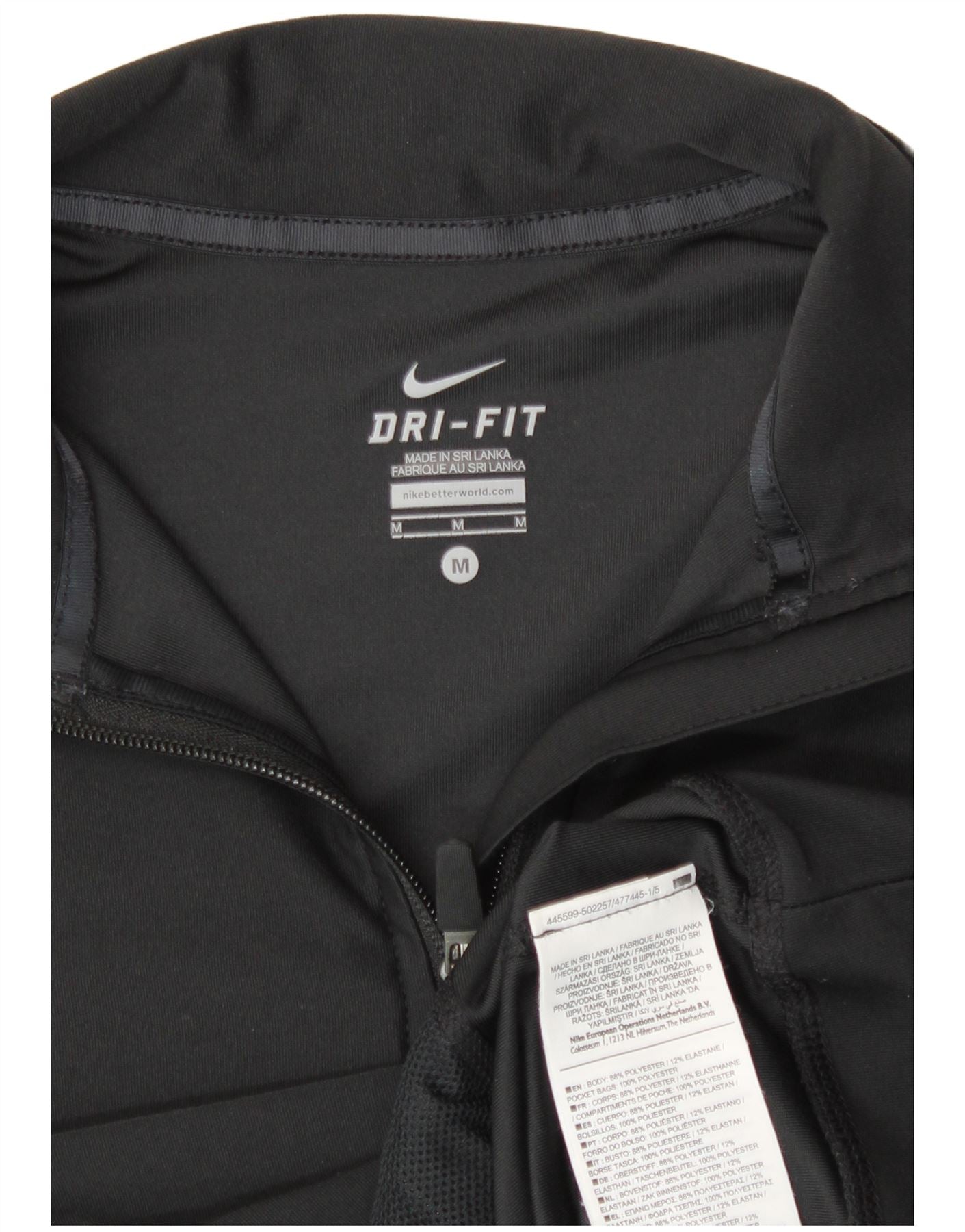 - AI Description: This Nike womens Windbreaker Jacket is crafted from a black polyester blend, offering a smooth, breathable, and stretchy finish. It features a collared neckline and a full zip closure. Long sleeves provide ample coverage. The athletic slim fit ensures a streamlined silhouette. Zipped pockets offer practical storage. A subtle Nike logo provides signature branding. This DRI-FIT jacket is perfect for active wear.