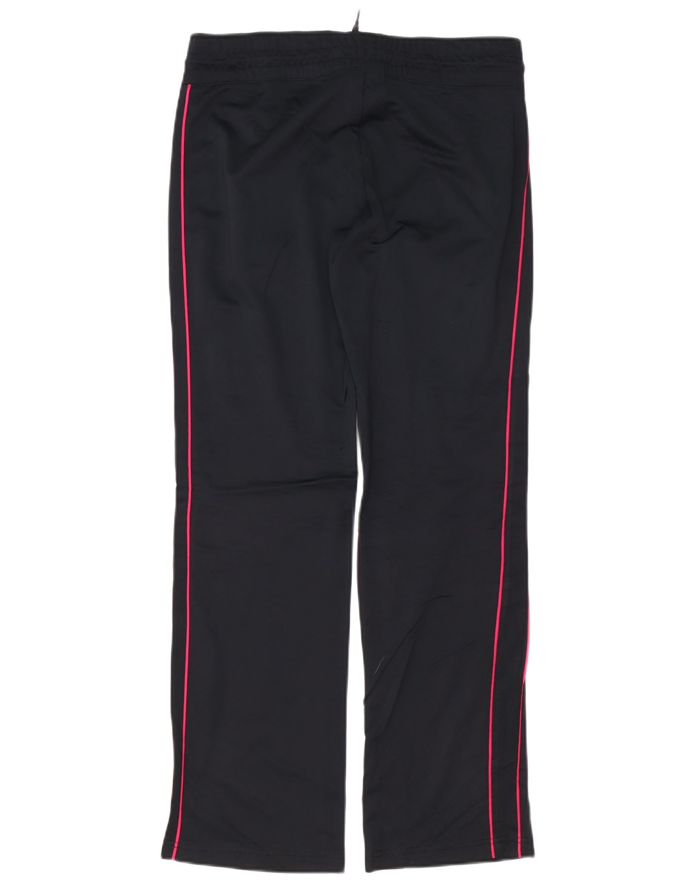 - AI Description: These Nike women's tracksuit bottoms are crafted from a comfortable black blended fabric. They feature a regular fit with an elasticated drawstring waist, ensuring adjustability. The straight leg design offers excellent ease of movement. Bright pink stripes run down each side, providing a vibrant contrast. A small Nike logo is subtly placed. Practical side pockets complete the design.