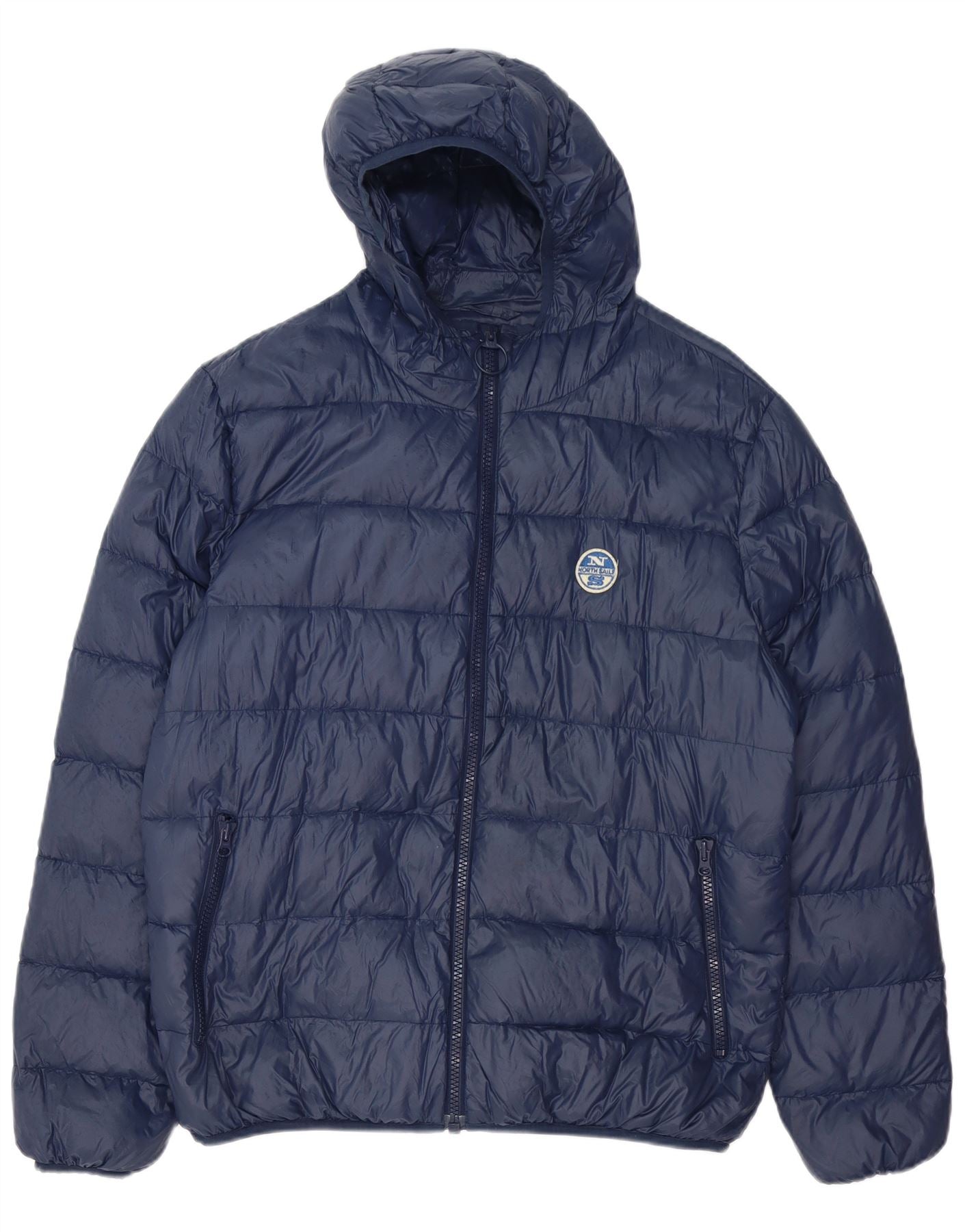 - AI Description: This North Sails mens padded jacket is crafted from 100 percent duck down, offering superior thermal insulation. Its quilted navy blue fabric provides a sleek, modern finish. It features a practical hooded design and long sleeves for full coverage. The full zip closure ensures a secure fit. A regular fit allows for comfortable layering. The quilted pattern adds subtle texture. A distinctive brand logo accents the chest.
