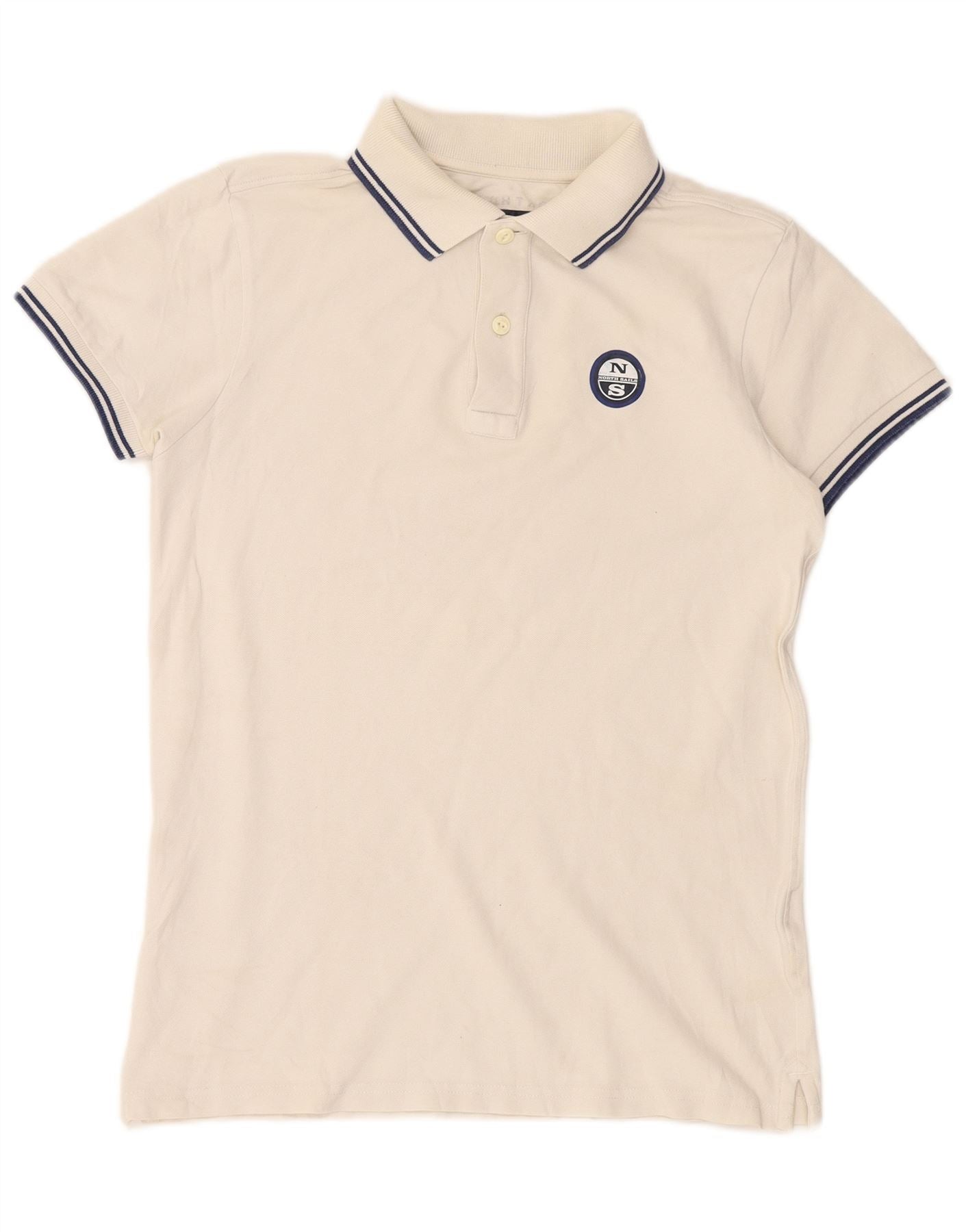 - AI Description: This North Sails womens polo shirt is crafted from a soft off-white knit fabric. It features a classic collared neckline and short sleeves. Navy blue tipping on the collar and sleeve cuffs adds a nautical touch. A button placket provides a neat closure. The embroidered brand logo on the chest completes the design. The regular fit offers comfortable wear.