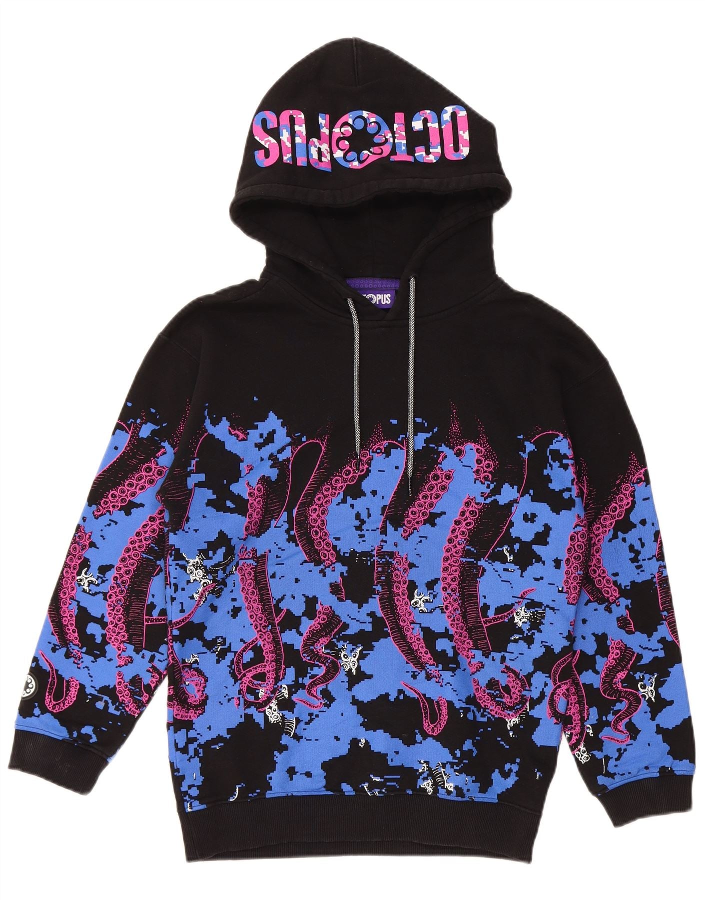 OCTOPUS Mens Graphic Hoodie Jumper Small Black Colourblock Cotton