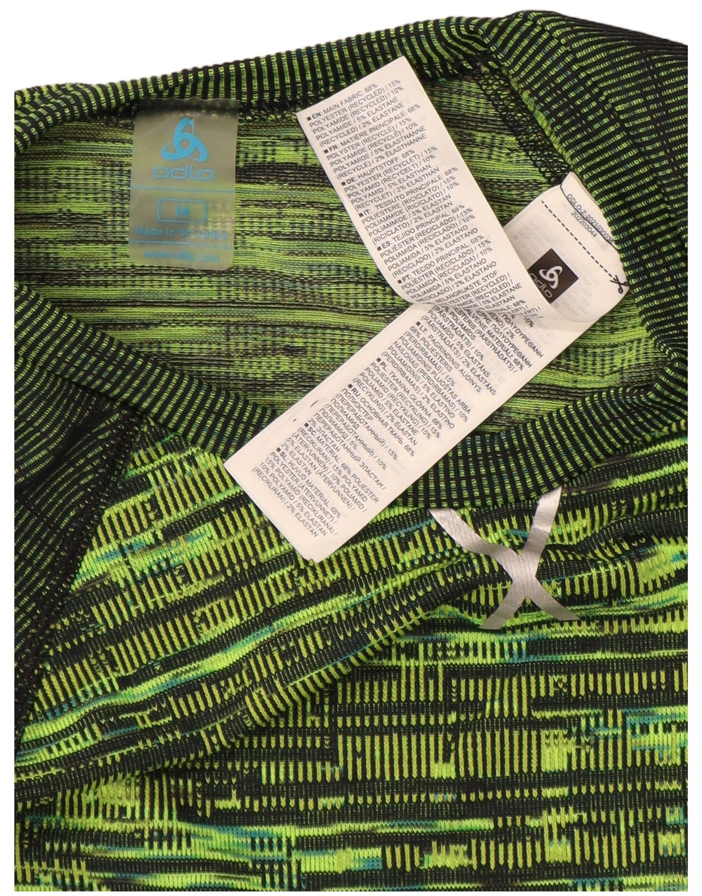 - AI Description: This Odlo womens long sleeve T-shirt top is crafted from a lightweight, breathable polyester blend with stretch. It features a classic round neck and long sleeves. The slim fit offers an athletic silhouette. A vibrant green abstract pattern with colourblock details covers the garment. The Odlo logo provides a subtle accent. Its design is ideal for running and sports, ensuring comfort and flexibility.