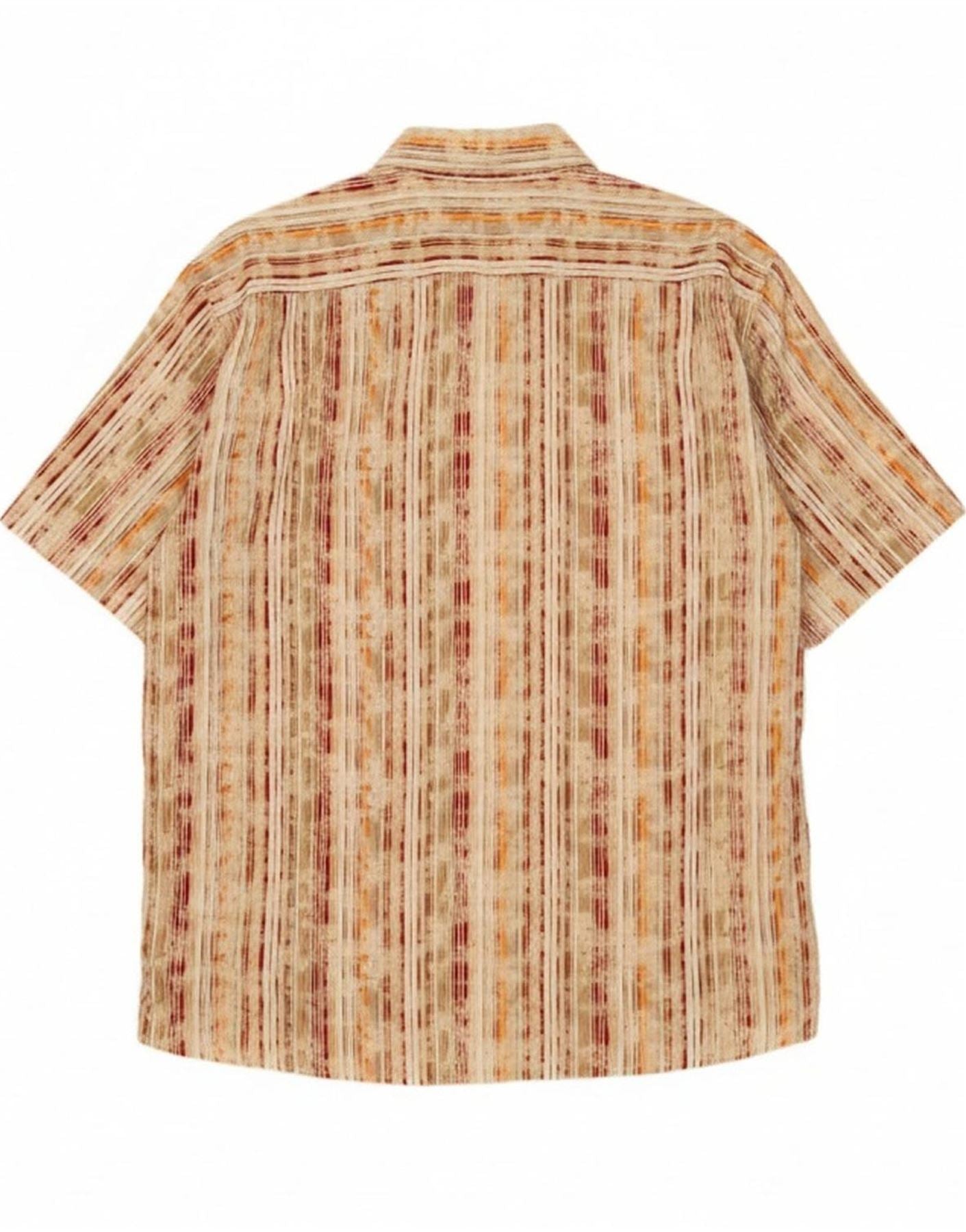 - AI Description: This Vintage mens shirt is crafted from a multicoloured woven fabric. It features a collared neckline and a full button-up front. Short sleeves and a regular fit offer a comfortable silhouette. The retro design is enhanced by its bold abstract striped pattern, creating a distinctive look. This shirt provides a relaxed yet stylish feel.