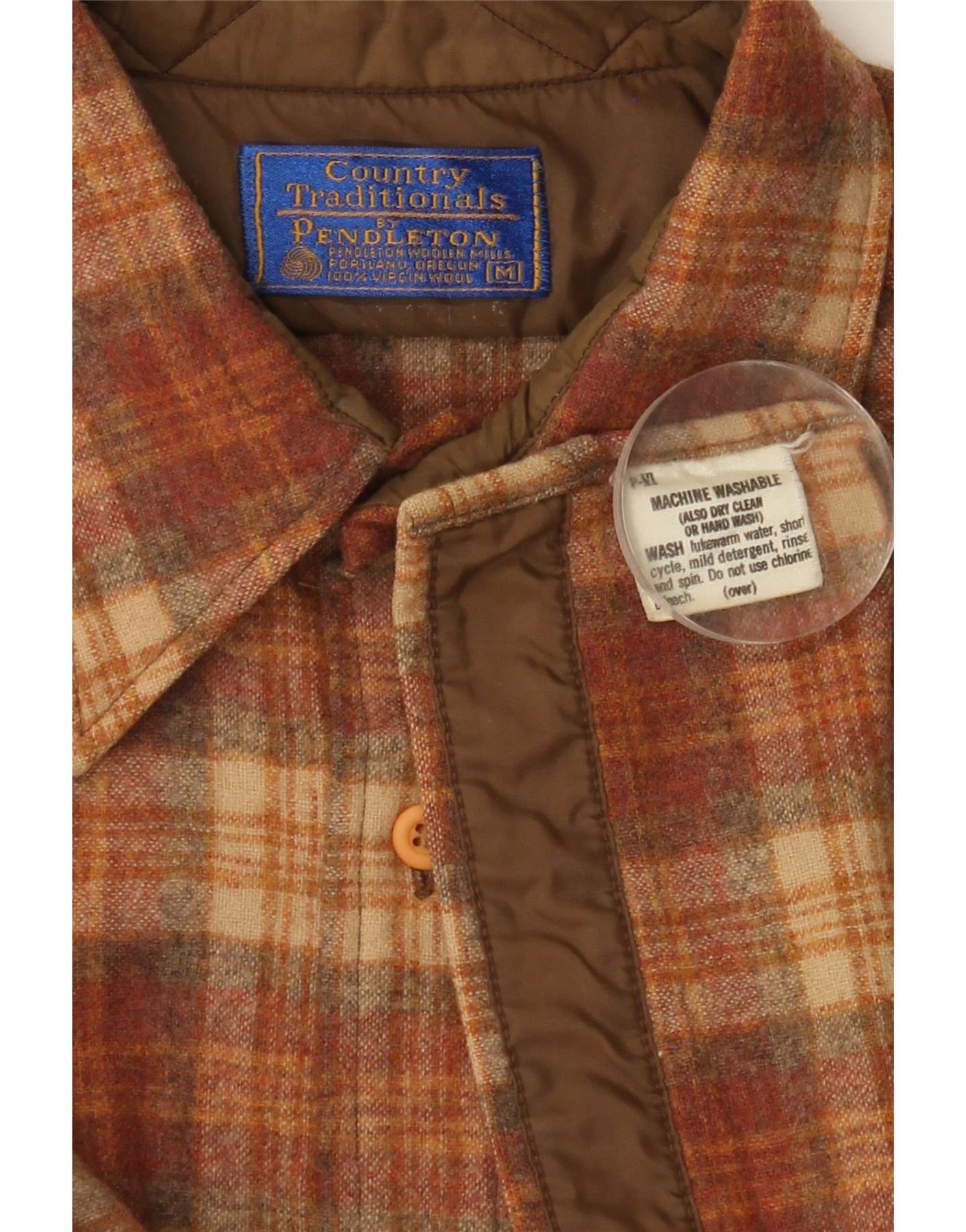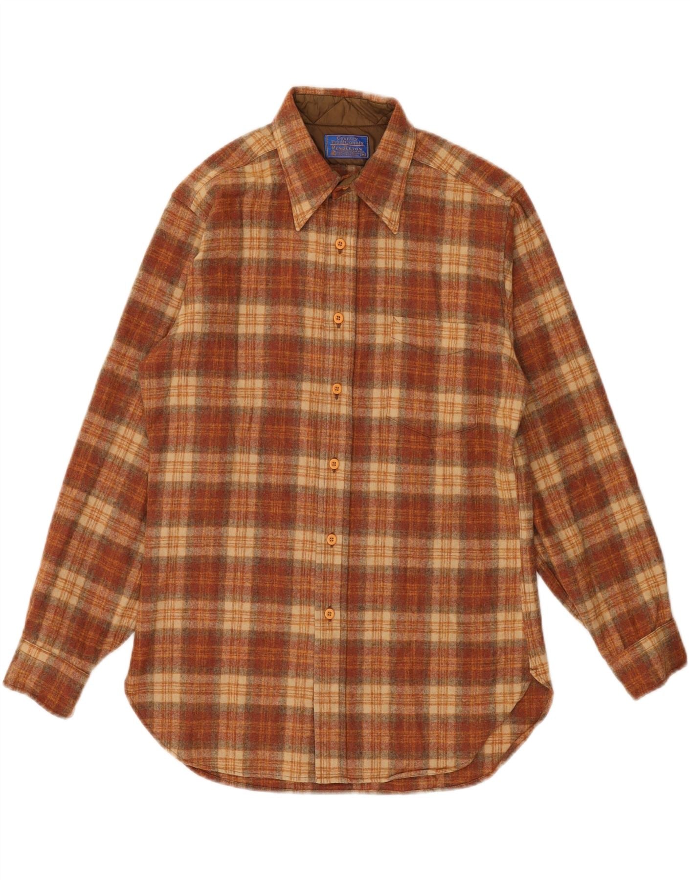 - AI Description: This Pendleton womens flannel shirt is crafted from 100 virgin wool flannel, offering a soft, warm texture. It features a classic plaid pattern in rich brown, orange, and beige tones. The collared neckline and button-up front provide a timeless look. Long sleeves and a regular fit ensure comfortable wear. It includes practical pockets and is fully lined for added warmth and structure. Tonal buttons complete the classic design.