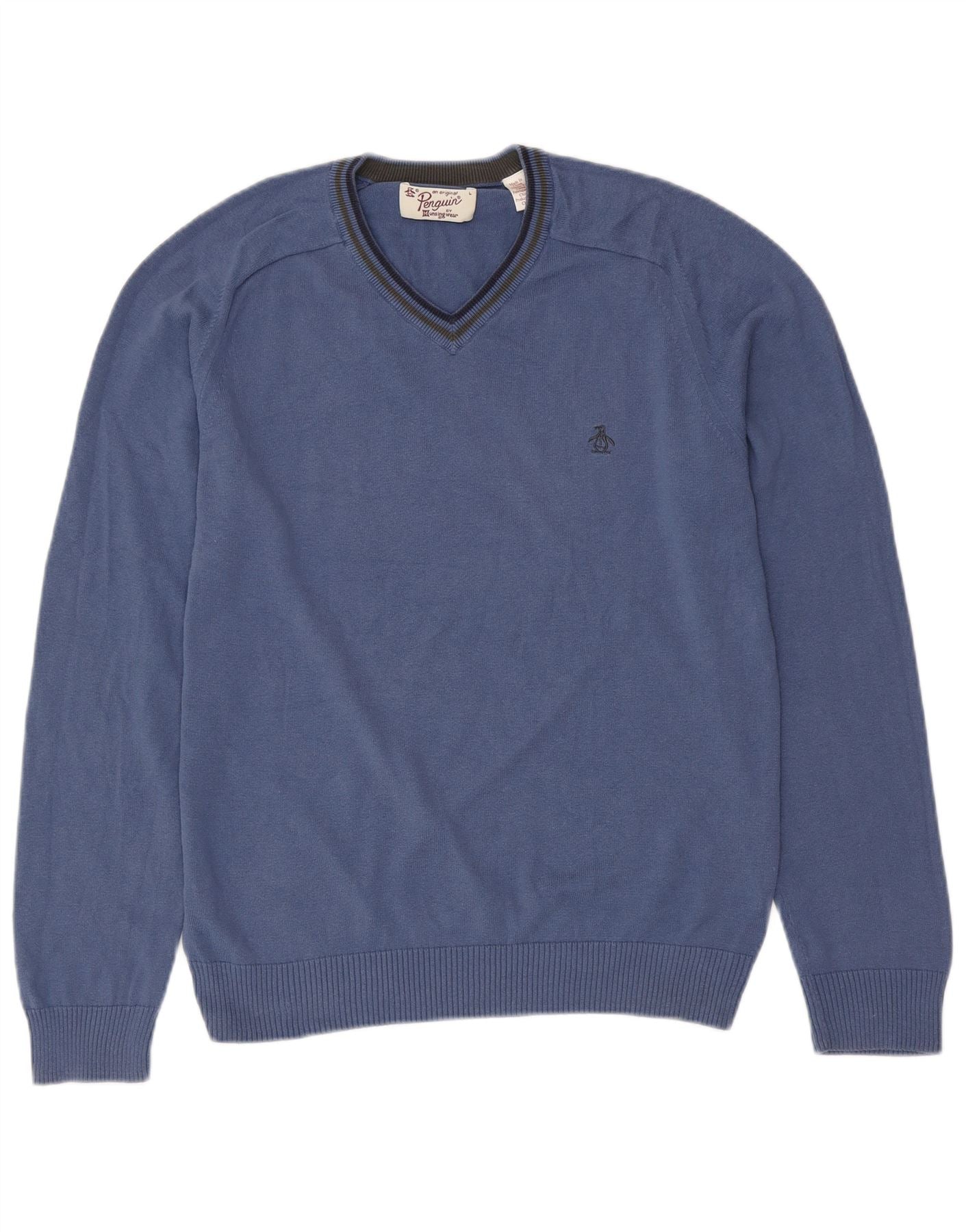 PENGUIN Mens V-Neck Jumper Sweater Large Blue Cotton