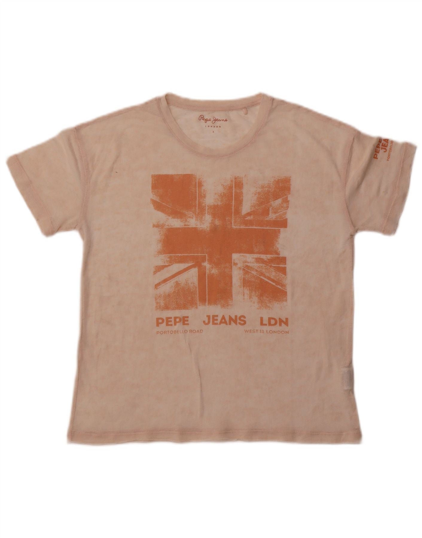 - AI Description: This PEPE Jeans womens Graphic T-Shirt Top is crafted from a soft cotton blend jersey, offering a comfortable feel. It features a classic round neckline and short sleeves for a timeless silhouette. The regular fit ensures ease of wear. A prominent orange Union Jack graphic adorns the front, with PEPE JEANS LDN text beneath, adding a distinctive British-inspired detail.
