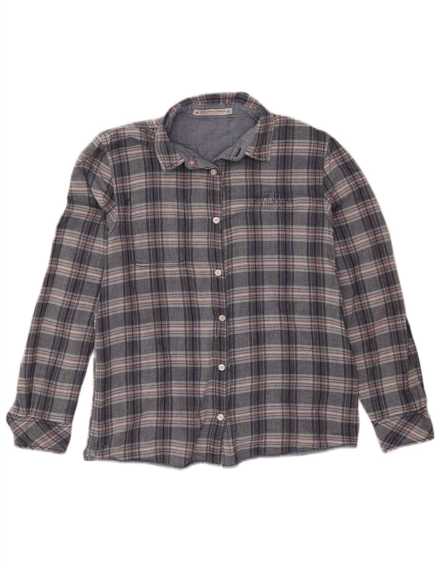 - AI Description: This PEPE Jeans boys' reversible denim shirt is crafted from soft blue chambray. It features a classic collared neckline and long sleeves with buttoned cuffs. The regular fit ensures comfortable wear. One side presents a plain blue finish with a chest pocket and subtle logo detail. The reverse reveals a stylish plaid pattern in grey and red tones. Full button closure completes the design, offering versatile styling options for any occasion.
