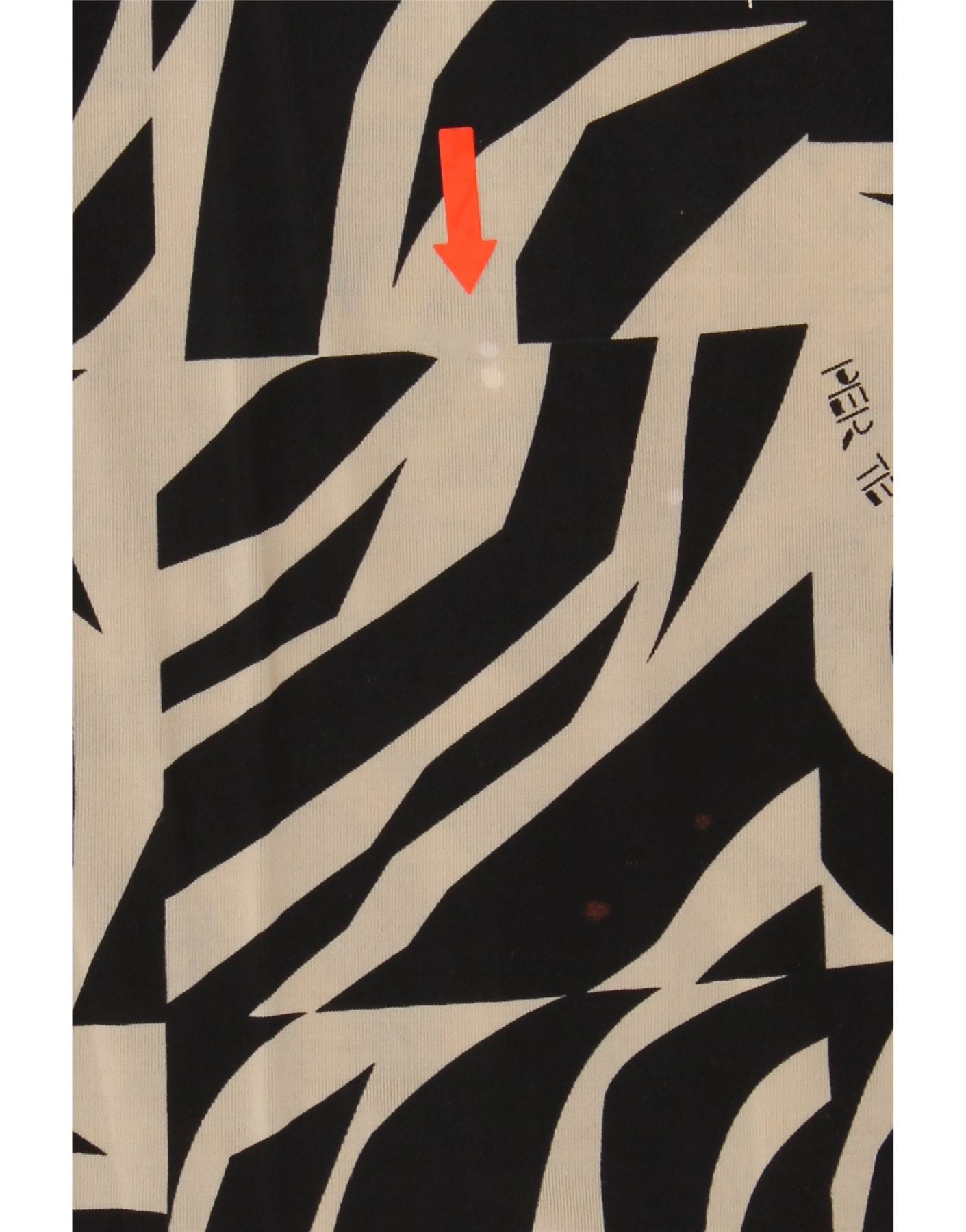 - AI Description: This Perte by Krizia designer blouse top is a stylish addition to any wardrobe. Crafted from rayon, this black blouse features a geometric pattern, round neckline, and 3/4 sleeves. The regular fit and pullover closure ensure a comfortable wear. The garment is pre-owned and in good condition, showcasing a beaded accent. Please note minor stains on the front.