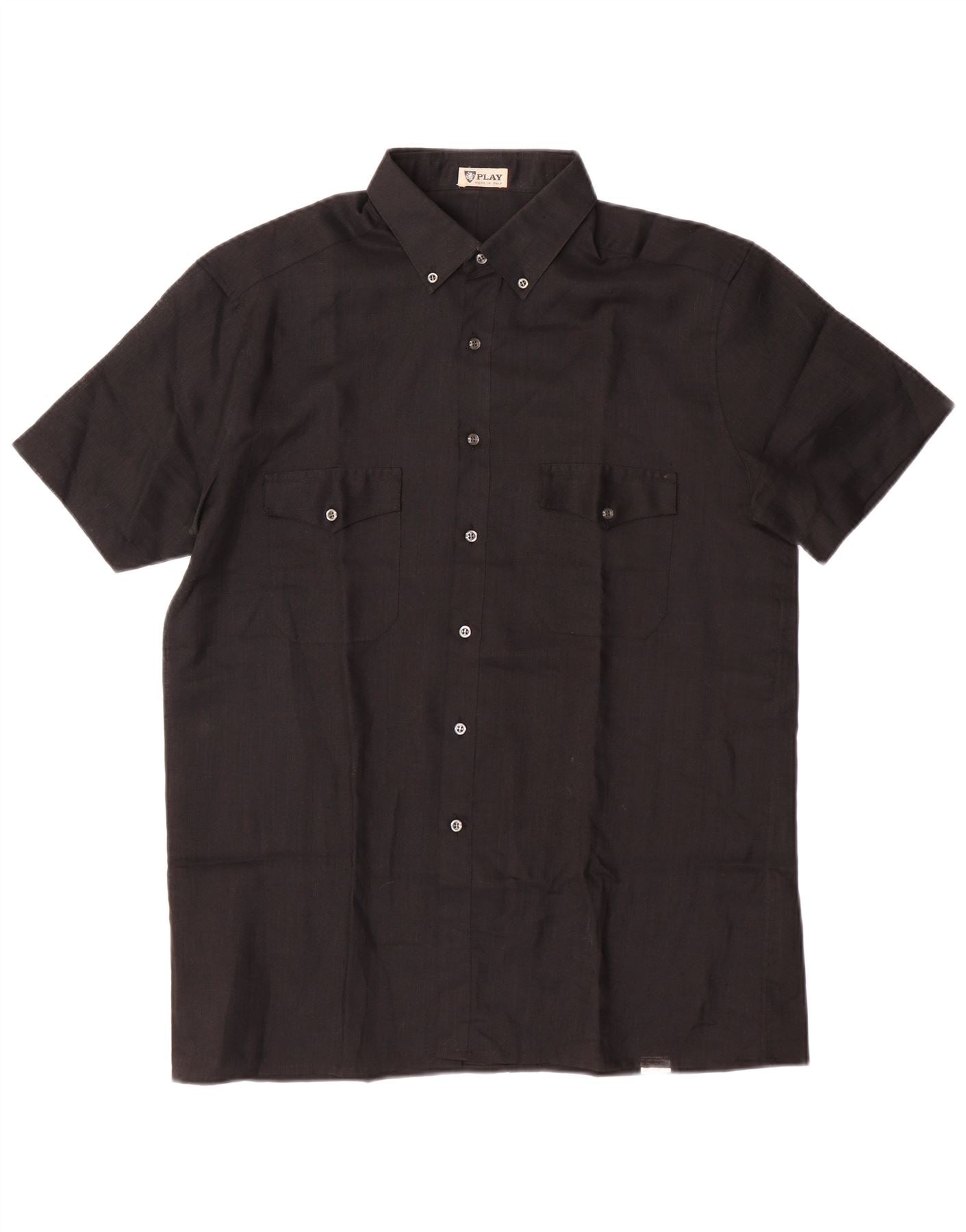 - AI Description: This Play mens shirt is crafted from a black polyester and linen blend, offering a lightweight, textured feel. It features a classic collared neckline and a full button-up front for a smart casual look. Short sleeves and a regular fit ensure comfort and ease of movement. Two chest pockets with button closures add practical detailing. The subtle vertical weave enhances its sophisticated, understated design.