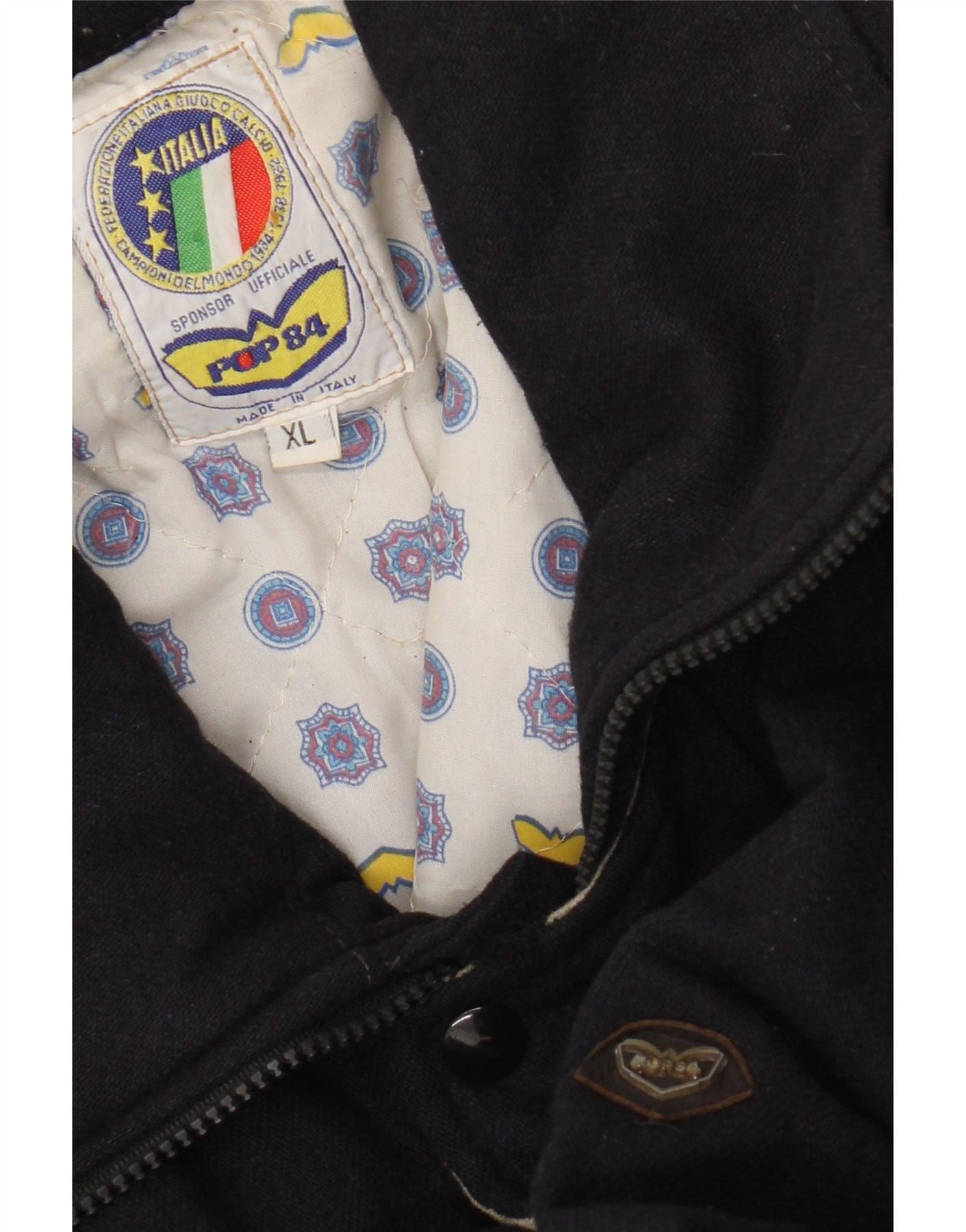 - AI Description: This Pop 84 men's Bomber Jacket comes in a deep navy blue blended fabric. It features a classic collared neckline and a full zip closure. The long sleeves and regular fit offer comfortable wear. It is fully lined with a quilted interior for warmth. Practical pockets are included, alongside adjustable waist buckles for a custom fit. This retro style jacket combines functionality with a timeless aesthetic.