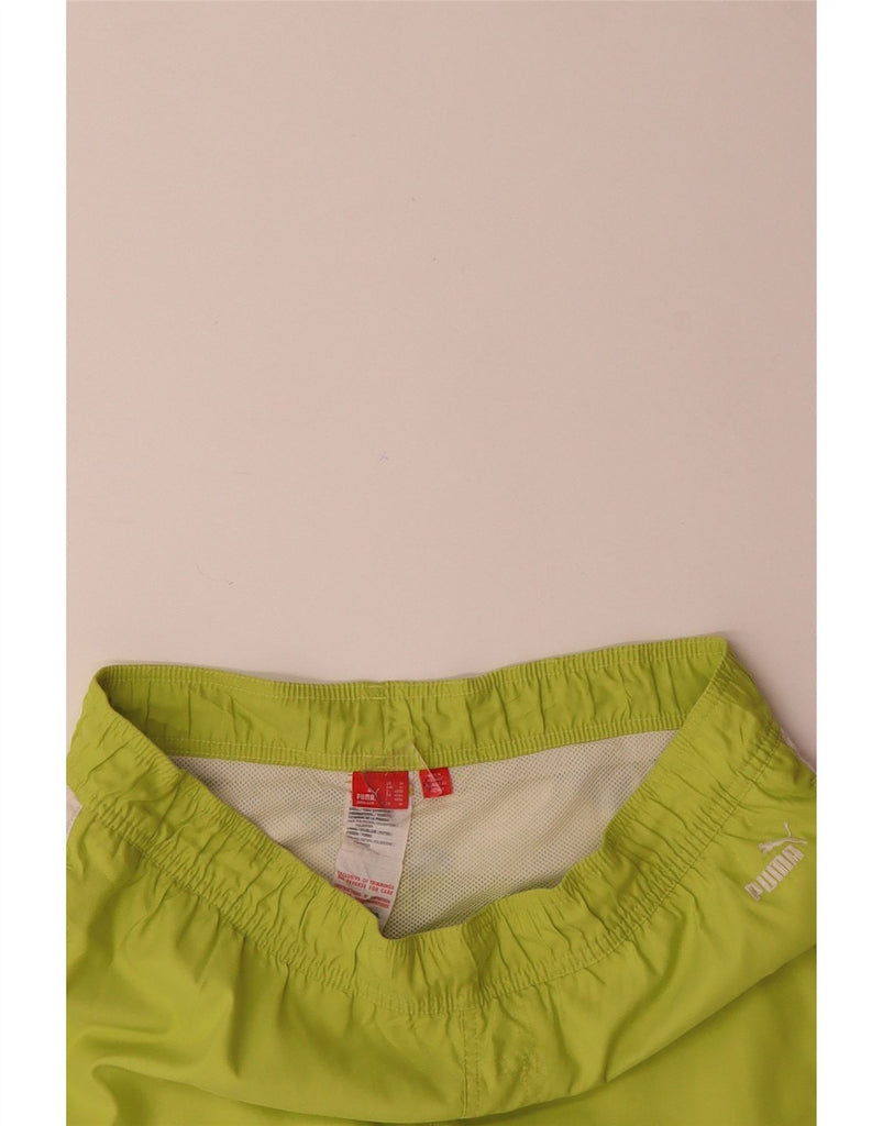 - AI Description: This Puma mens sports shorts are crafted from lightweight, breathable 100 percent polyester woven fabric. They feature an elasticated pull on waist for a relaxed athletic fit. A prominent graphic and logo accent add a dynamic touch. The design ensures comfort and ease of movement, perfect for active wear. These green shorts are ideal for any sport.