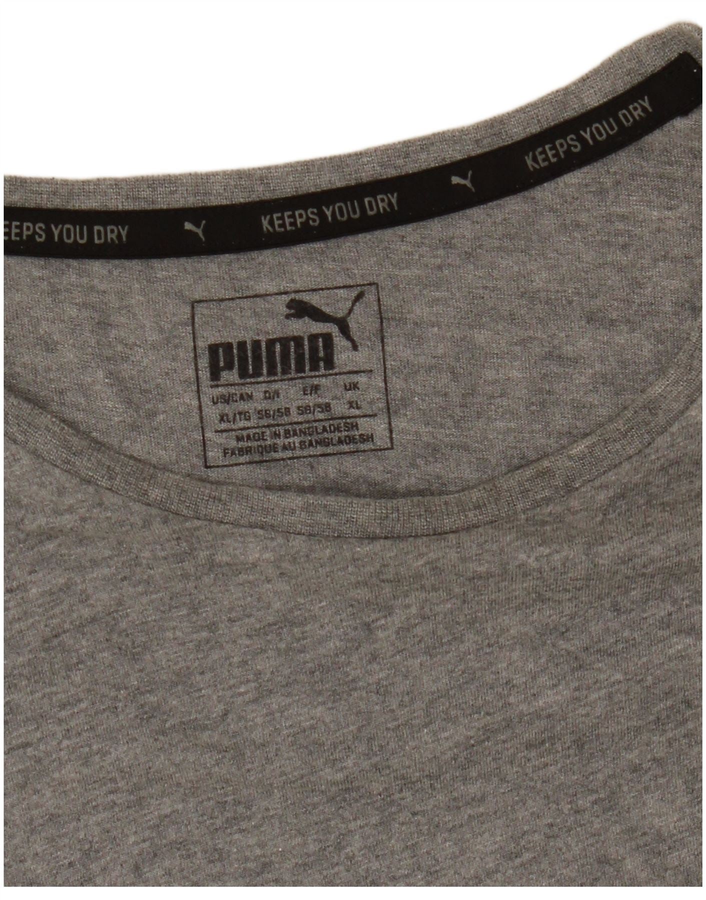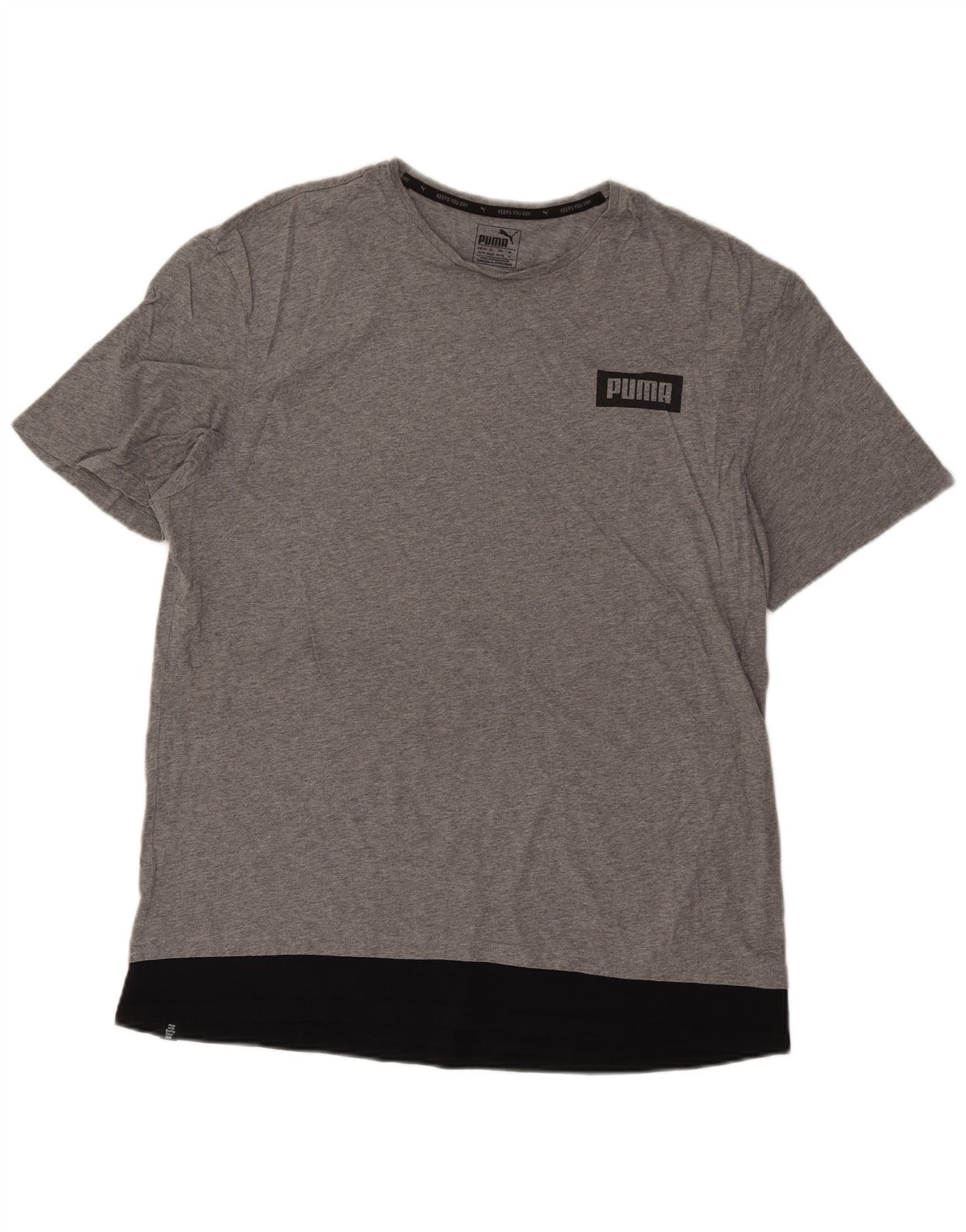- AI Description: This Puma mens graphic T-shirt top is crafted from soft grey jersey fabric. It features a classic round neckline and comfortable short sleeves. The regular fit ensures ease of movement. A distinct black panel accents the hem. The Puma logo is prominently displayed on the front and back, adding a sporty detail. This breathable and lightweight top offers excellent comfort.