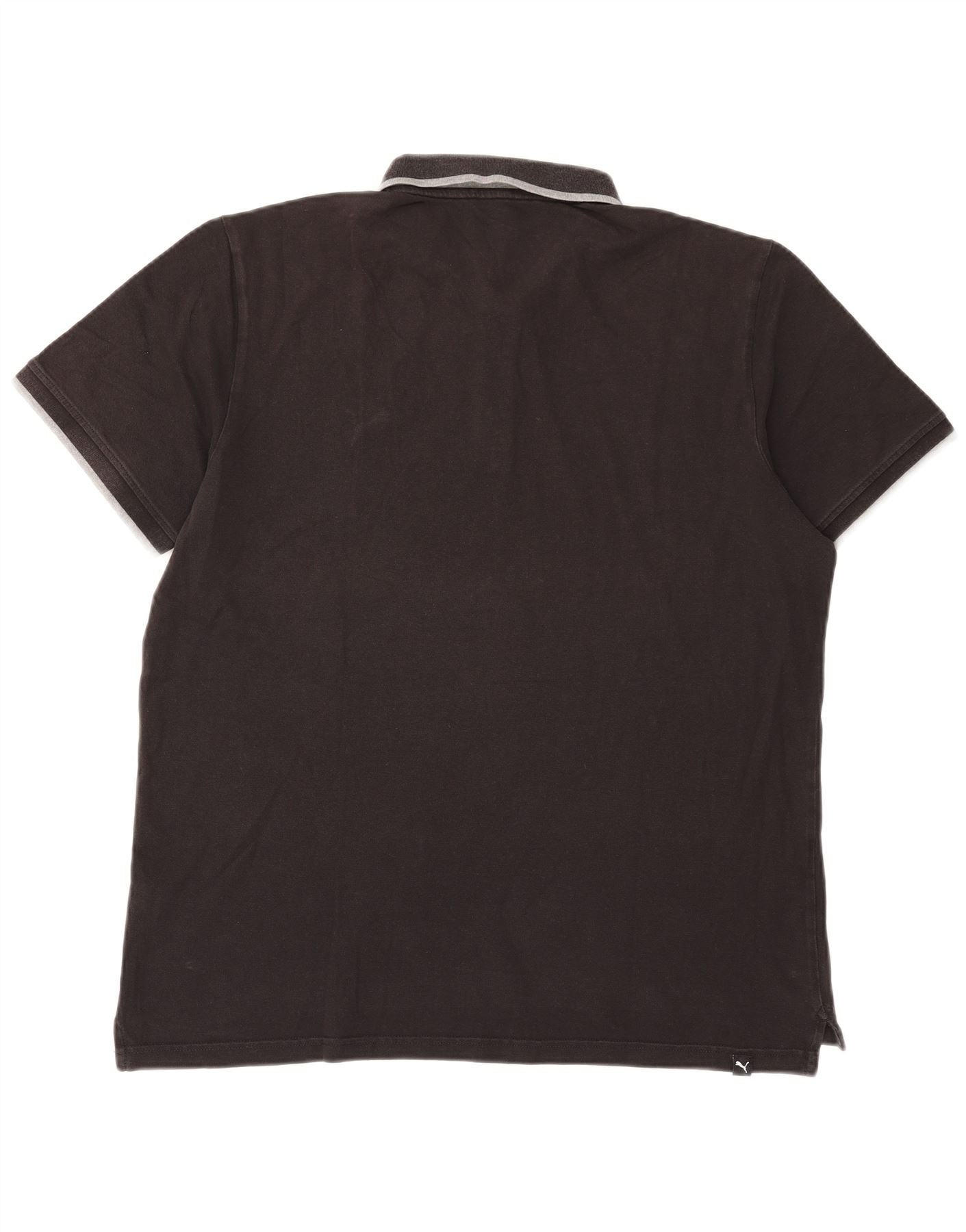 - AI Description: This Puma mens polo shirt is crafted from a comfortable black cotton blend fabric. It features a classic collared neckline with a subtle grey trim, complemented by a three-button placket. Short sleeves also include matching grey trim for a cohesive look. The regular fit ensures ease of movement and comfort. A distinctive white Puma logo is embroidered on the chest, adding a signature touch.